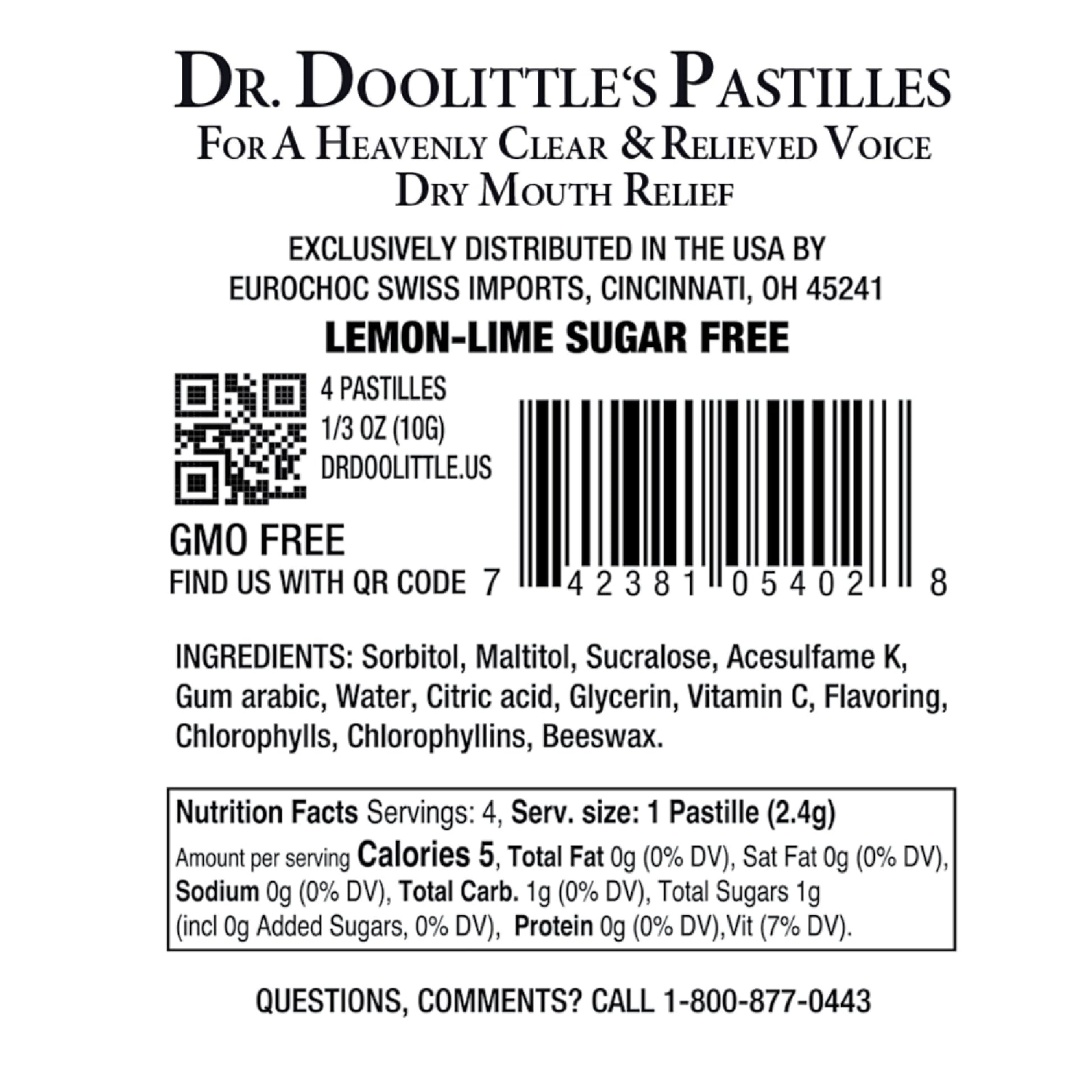 Do you often find yourself with a scratchy throat, strained voice, or dry mouth Many people find themselves suffering from these chronic conditions and either arenAt sure what to do or donAt want to medicate Thankfully, Dr DoolittleAs pastilles offer relief in a natural and delicious way Our pastilles should be enjoyed much like a throat lozenge or cough drop, but unlike the hard candy-like counterparts, they are soft and chewy like a gummy Made from sweet fruit extracts and packed with vitamin c, our pastilles not only help with hoarseness, overworked vocal cords, cough, or minor throat irritations, but they also have a delicious flavor that is not medicinal What makes pastilles so unique is that glycerin is a key ingredient It helps to keep your mouth and throat moisturized and can help loosen up a strained voice - which makes them great for professional speakers and singers Dr DoolittleAs original recipe has been expanded to include more tasty fruit flavors and a sugar-free formula, but besides that, not much has changed Made in Switzerland, we utilize the valuable herbs found in the Alps, which only enhances our proprietary formula The next time you feel a tickle in your throat or if you just want to maintain optimal moisture in your mouth, pop a pastille for simply heavenly results