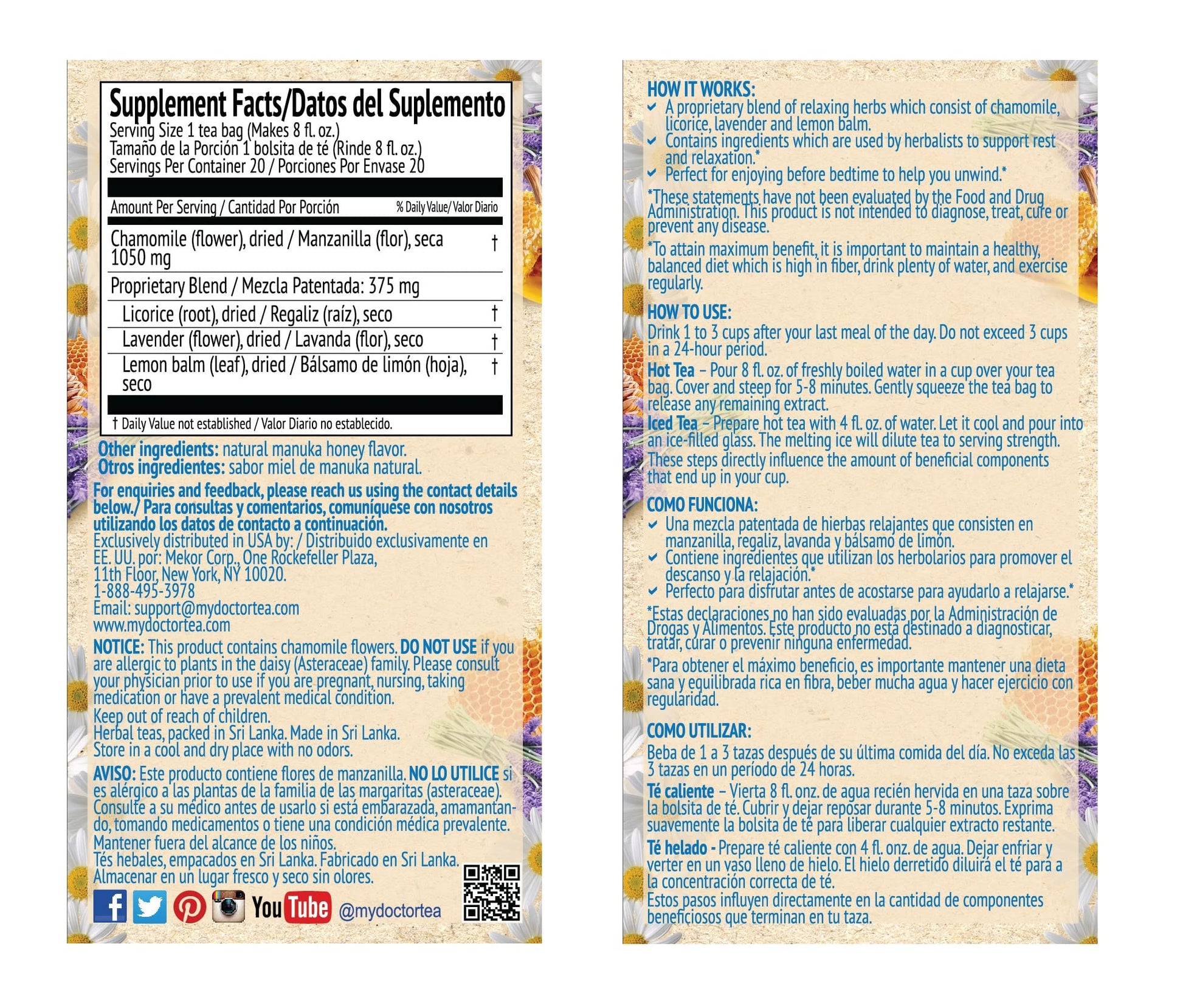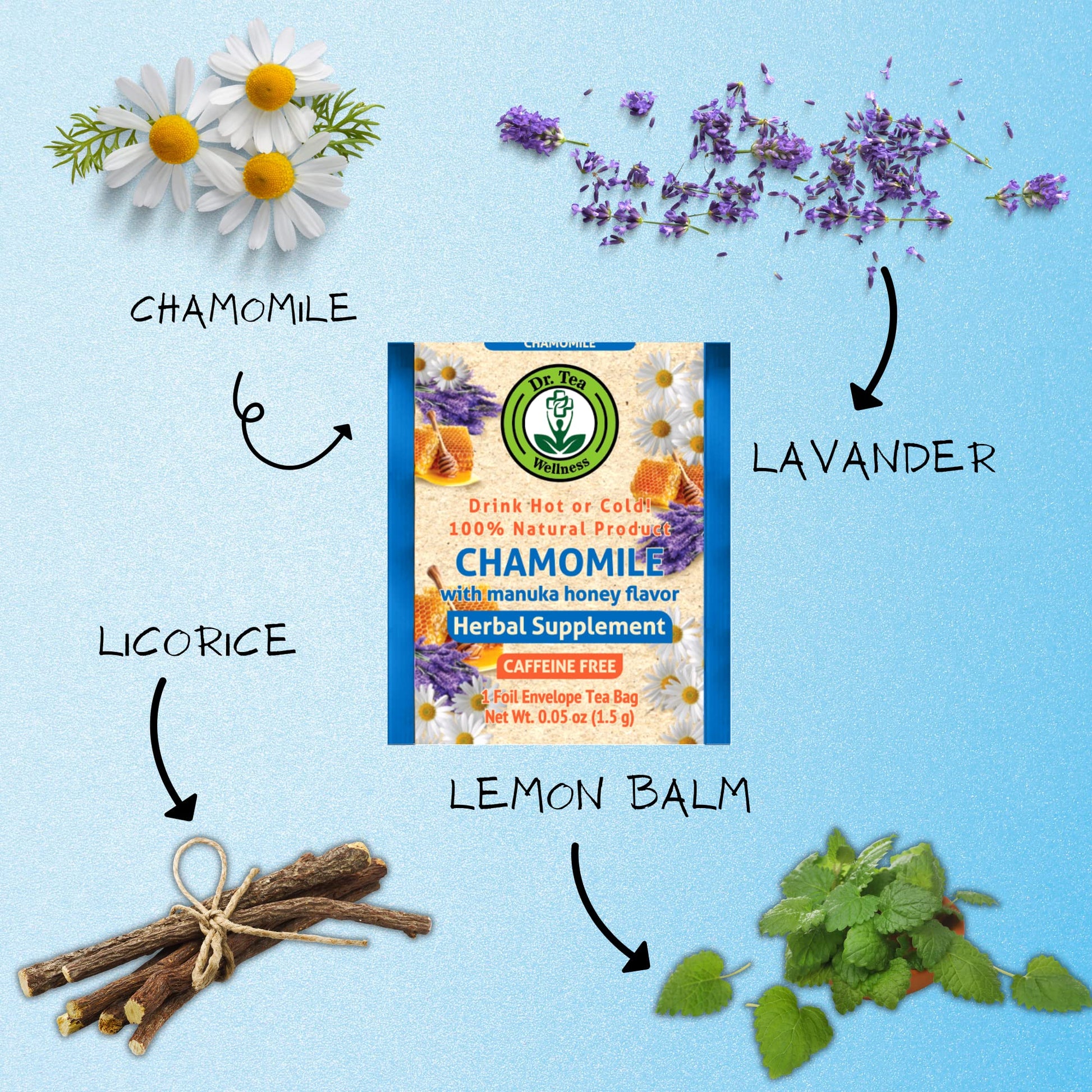 Q: What are the key ingredients in Dr. Tea Wellness Chamomile Herbal Tea?A: Dr. Tea Wellness Chamomile Herbal Tea features a calming blend of chamomile flower, licorice root, lavender flower, and lemon balm leaf, all enhanced with the natural sweetness of manuka honey flavor.