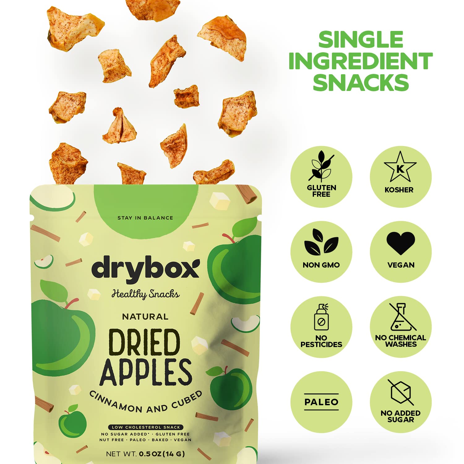 - Q: What are the main ingredients in Drybox Dried Cinnamon Apple Cubed Snack Packs? A: Drybox Dried Cinnamon Apple Cubed Snack Packs are made from 100% pure dried apples with no added sugars, preservatives, or artificial ingredients. They are a single ingredient snack, ensuring you get the natural taste of apples enhanced with sweet cinnamon.
