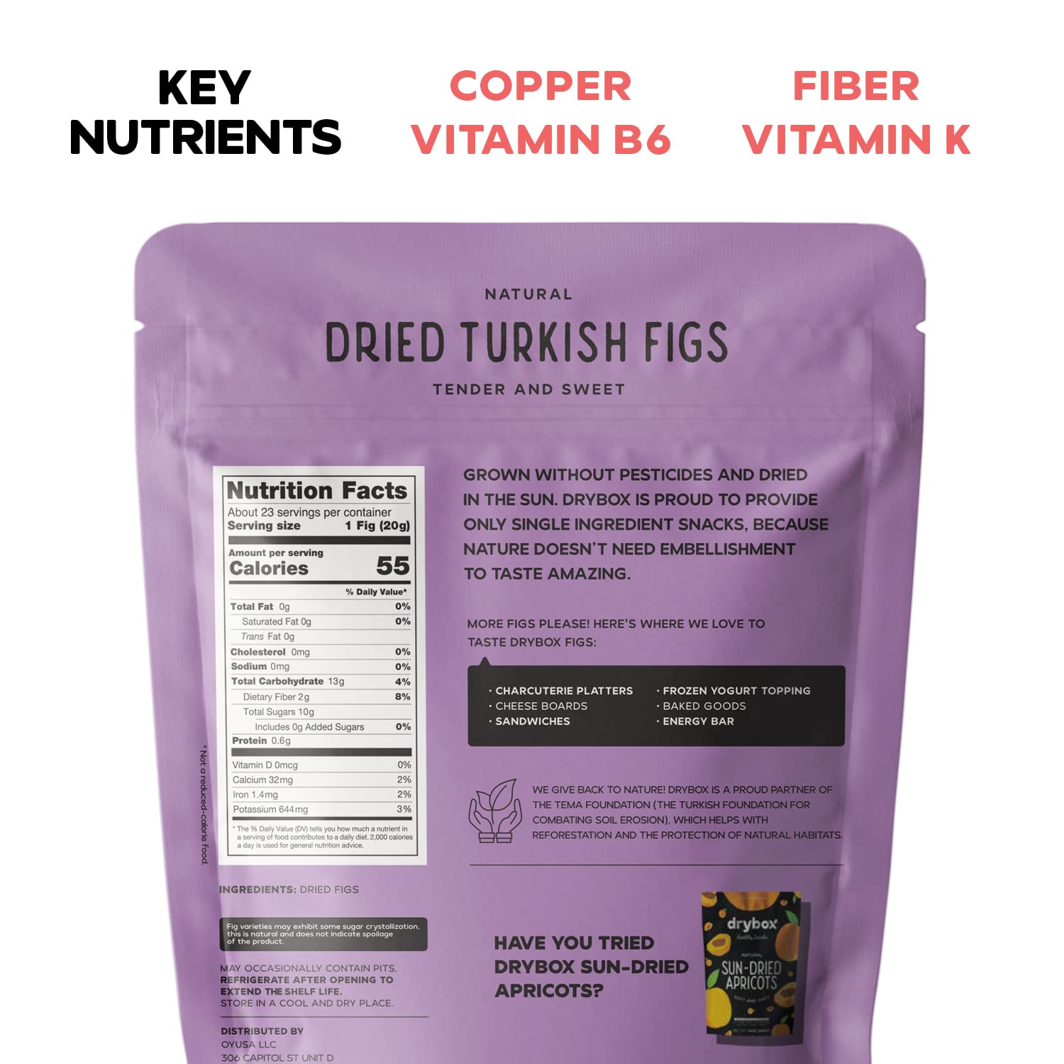 - Q: What are the ingredients in Drybox Organic Dried Turkish Figs? A: Drybox Organic Dried Turkish Figs contain only one ingredient: organic dried figs. They do not include any preservatives, additives, or sugars.