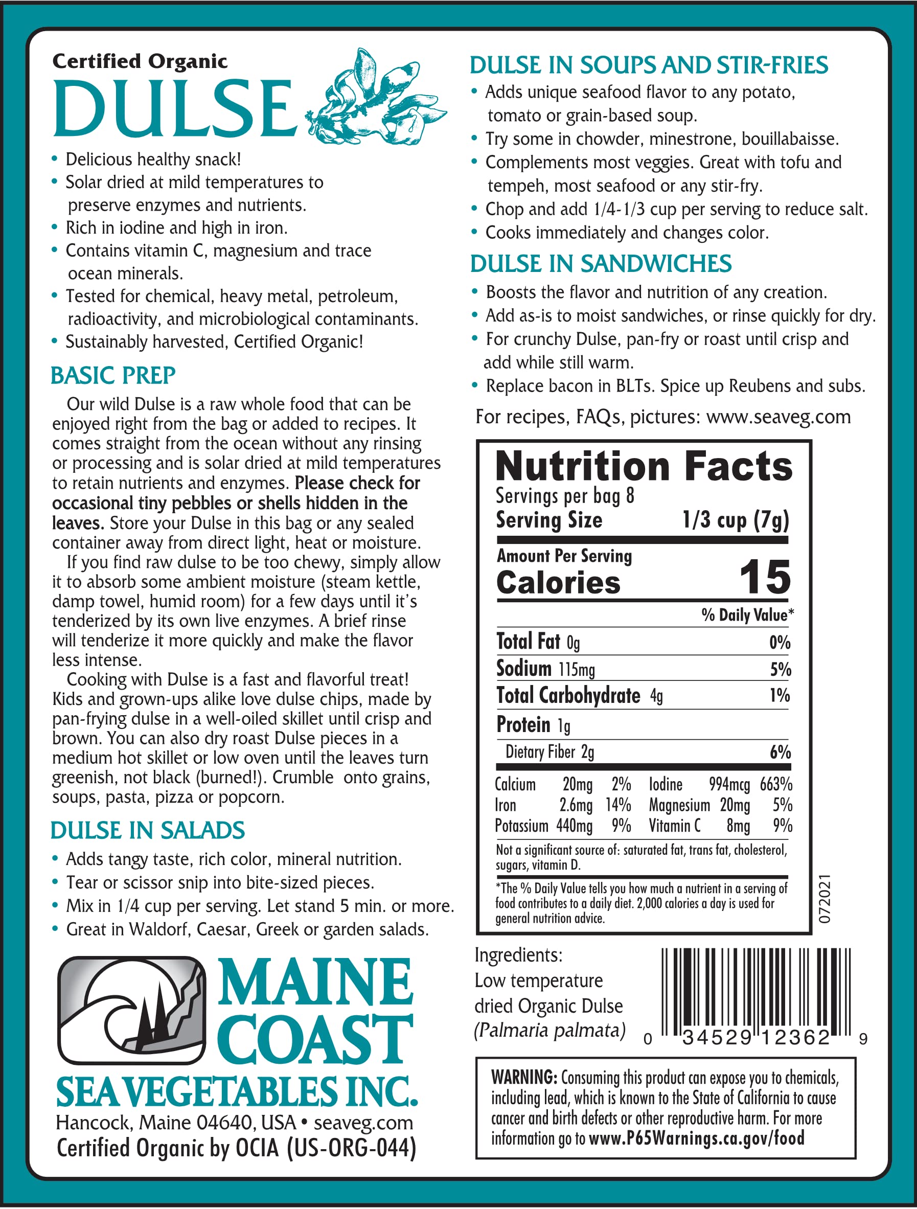 Premium organic dulse (Palmaria palmata) whole leaf in a convenient 2-ounce bag. Dulse whole leaf can be enjoyed right out of the bag or in a variety of popular recipes. The high protein and mineral content of dulse adds savory umami flavor to any dish, but we find it goes especially well with starches and sharp cheeses (Try this easy recipe). Sustainably wild-harvested in the pristine waters of the North Atlantic, and lab-tested for quality and contaminants. Also available in bulk.Certified OrganicDried at low temperatures to preserve enzymes, nutrients, and the environmentDulse doesnt need to be cooked! Tastes great raw!Dulse contains more protein and dietary fiber than most other sea vegetables and land vegetables.Dulse also contains vitamin A (beta-carotene), iron, potassium, magnesium, chlorophyll, trace ocean minerals, and B vitamins.