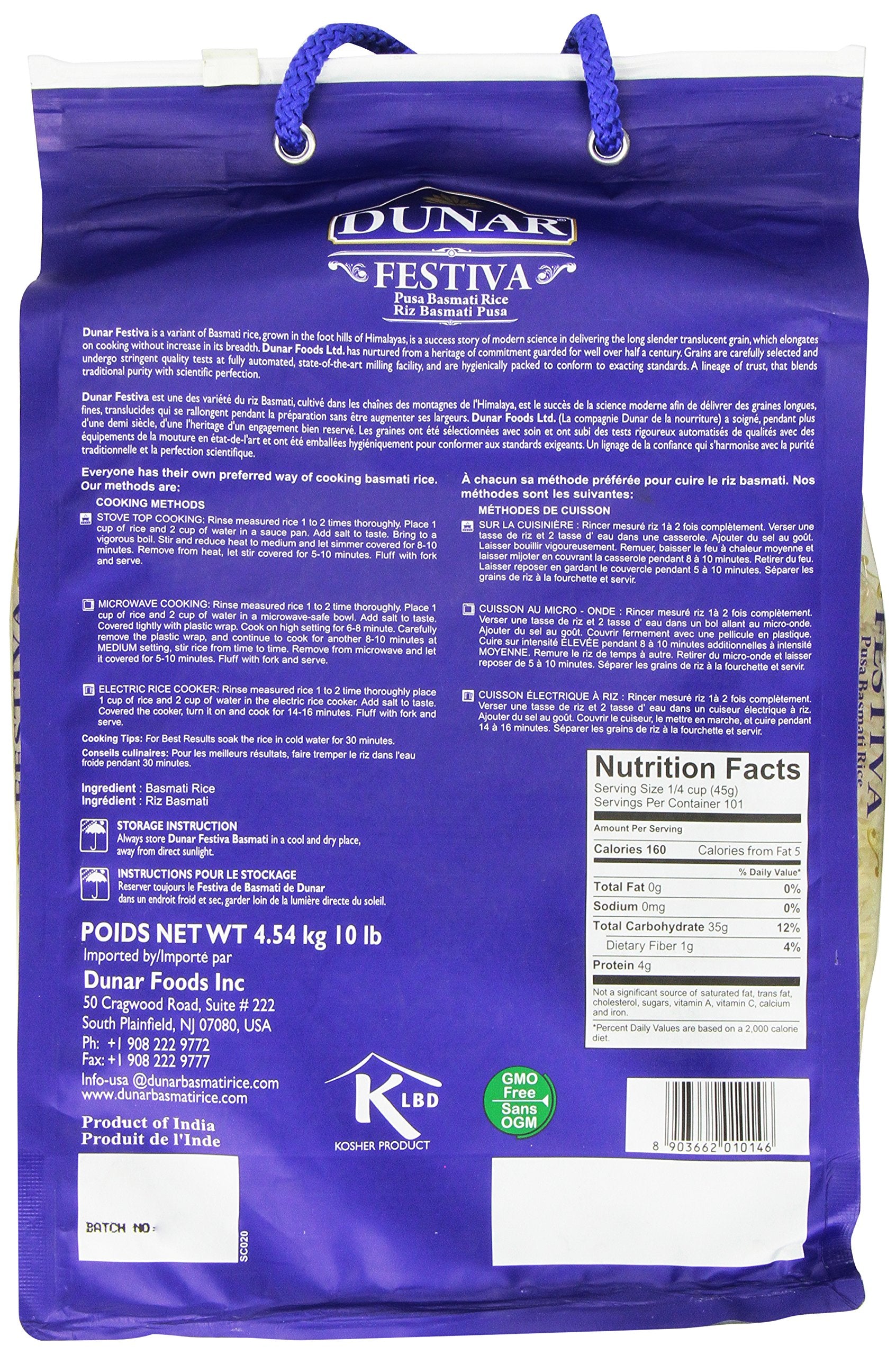 Q: What is the cooking time for Dunar Festiva Pusa Basmati Rice?A: Typically, Dunar Festiva Pusa Basmati Rice requires about 15-20 minutes of cooking time. It's recommended to rinse the rice before cooking to remove excess starch for the best texture.