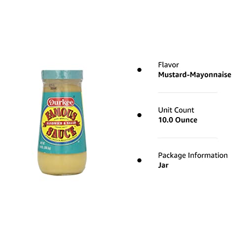 - Q: What is the packaging size of Durkee Famous Sauce? A: Durkee Famous Sauce is available in a convenient 10-ounce bottle, making it easy to store and use in your kitchen.