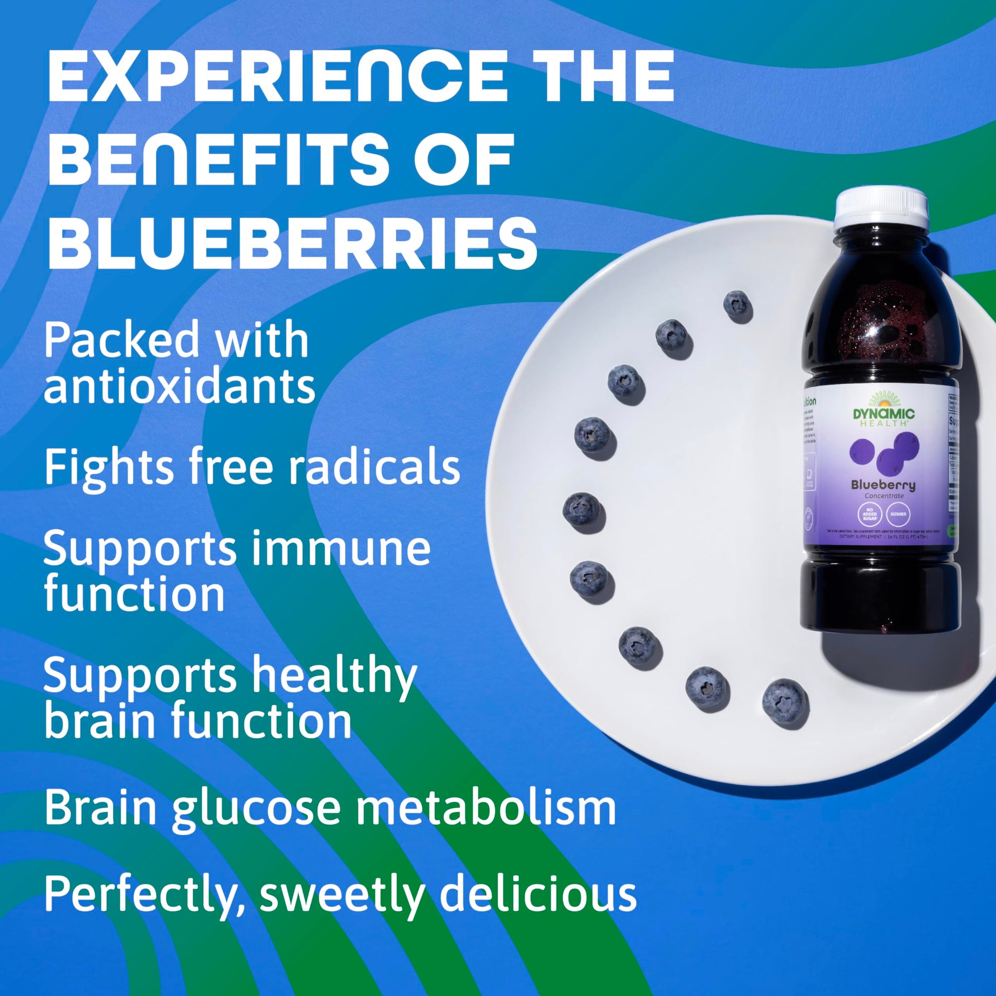 - Q: What makes Dynamic Health Blueberry Concentrate different from other juice products? A: Dynamic Health Blueberry Concentrate stands out due to its commitment to using 100% organic produce and real juice without fillers or water. Each bottle contains the equivalent of 1,500 blueberries, ensuring you get maximum nutritional benefits.