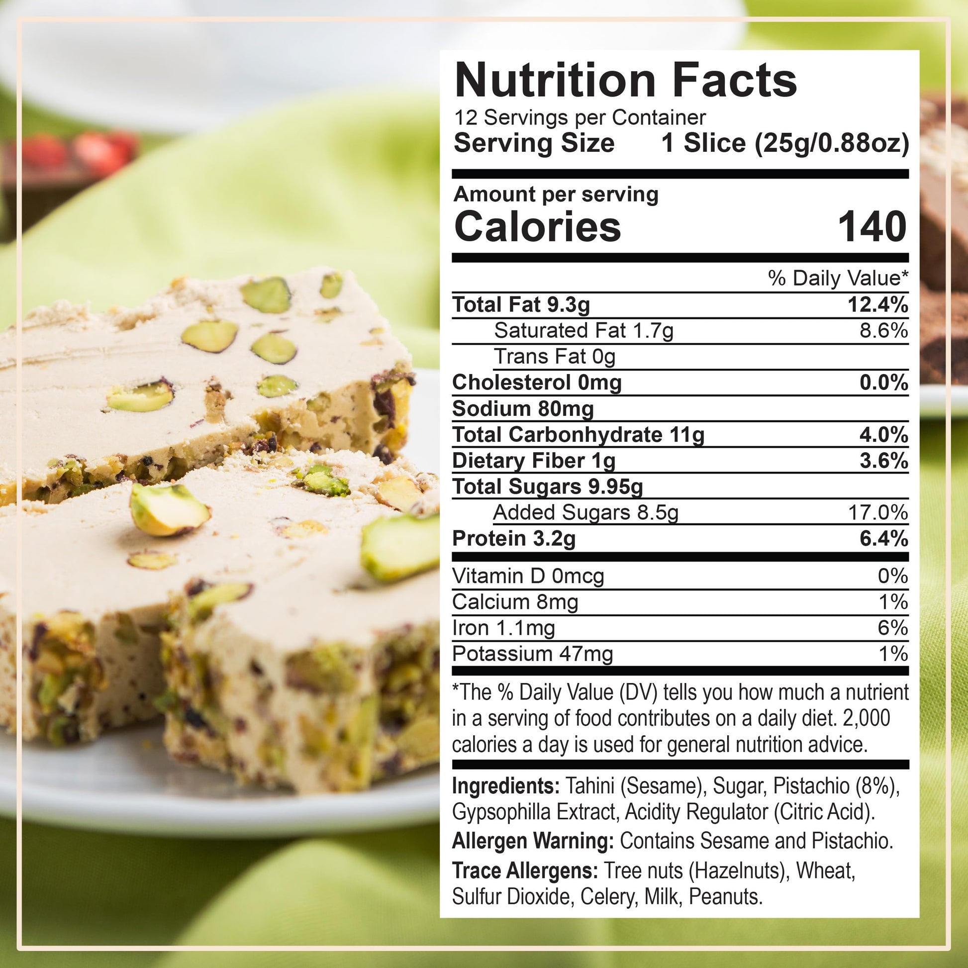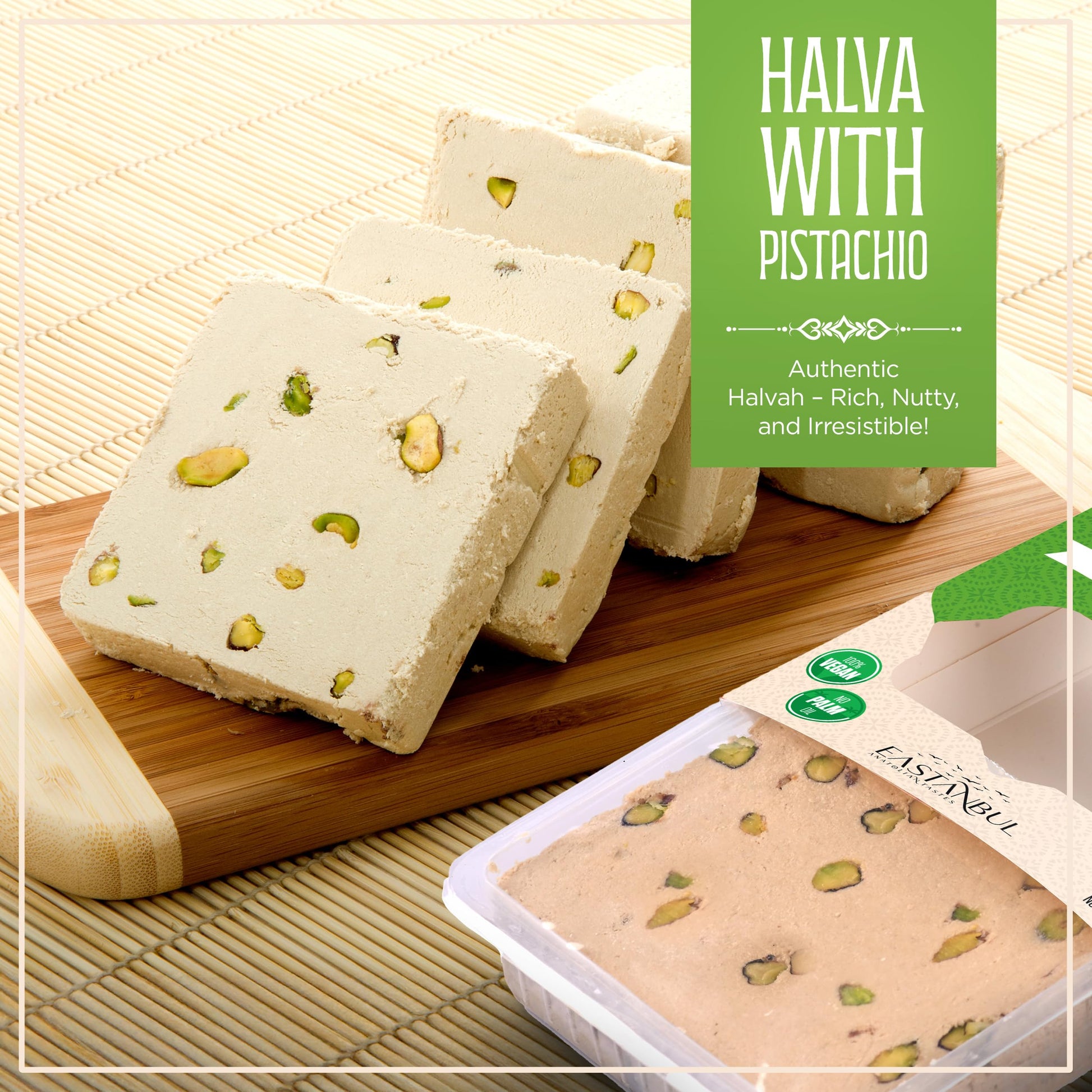 Eastanbul Halvah, 10.6Ozsavor The Luxurious Fusion Of Rich, Nutty Pistachios And Smooth Tahini With Eastanbul Halvah With Pistachio. This Traditional Turkish Halva Combines The Authentic Sesame Flavor Of Tahini With The Irresistible Crunch And Flavor Of Premium Pistachios. Vegan, Gluten-Free, And Non-Gmo, This Decadent Dessert Is Perfect For Those Looking To Indulge In A Pure, Wholesome Treat While Experiencing The Rich Flavors Of Turkish Confectionery.Features:Traditional Sesame Halva With Pistachio: Crafted With High-Quality Tahini (Sesame Paste) And Filled With Crunchy, Roasted Pistachios For An Extra Layer Of Flavor And Texture.Vegan &Amp; Gluten-Free: Made With Plant-Based Ingredients, Suitable For Vegan And Gluten-Free Diets, Offering A Delicious Dessert Without Compromise.Non-Gmo: Contains Only Natural, Non-Genetically Modified Ingredients For A Wholesome Treat.Smooth, Creamy, And Crunchy: The Smooth Texture Of The Halva Is Beautifully Contrasted By The Satisfying Crunch Of Pistachios, Creating A Delightful Eating Experience.Rich In Sesame &Amp; Pistachios: The Tahini Provides A Nutty Foundation, Enhanced By The Bold, Earthy Taste Of Pistachios For A Unique, Balanced Flavor.Flavor Profile:Nutty &Amp; Sweet With Pistachio: The Sweet, Creamy Sesame Flavor Is Beautifully Complemented By The Earthy, Nutty Taste Of Pistachios.Creamy &Amp; Crunchy: A Delightful Balance Of Smooth Halva With A Satisfying Pistachio Crunch In Every Bite.Rich, Roasted Pistachio Notes: The Roasted Pistachios Infuse The Halva With A Deeper, Savory Flavor That Elevates The Sweetness Of The Sesame.Uses: