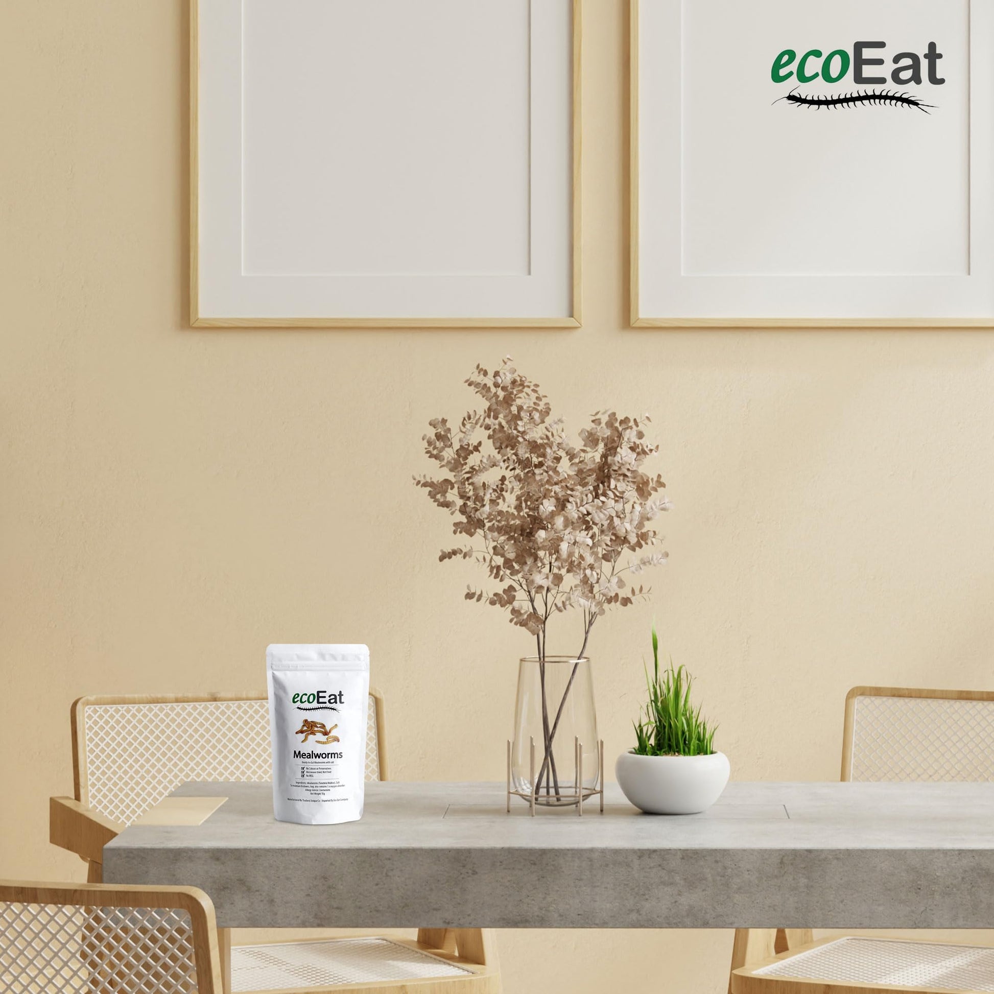 Q: What are the main ingredients in ecoEat Edible Insects Mealworms?A: The main ingredients in ecoEat Edible Insects Mealworms are dehydrated mealworms (Tenebrio Molitor) and salt. Each bag also contains an oxygen absorber to help maintain freshness.