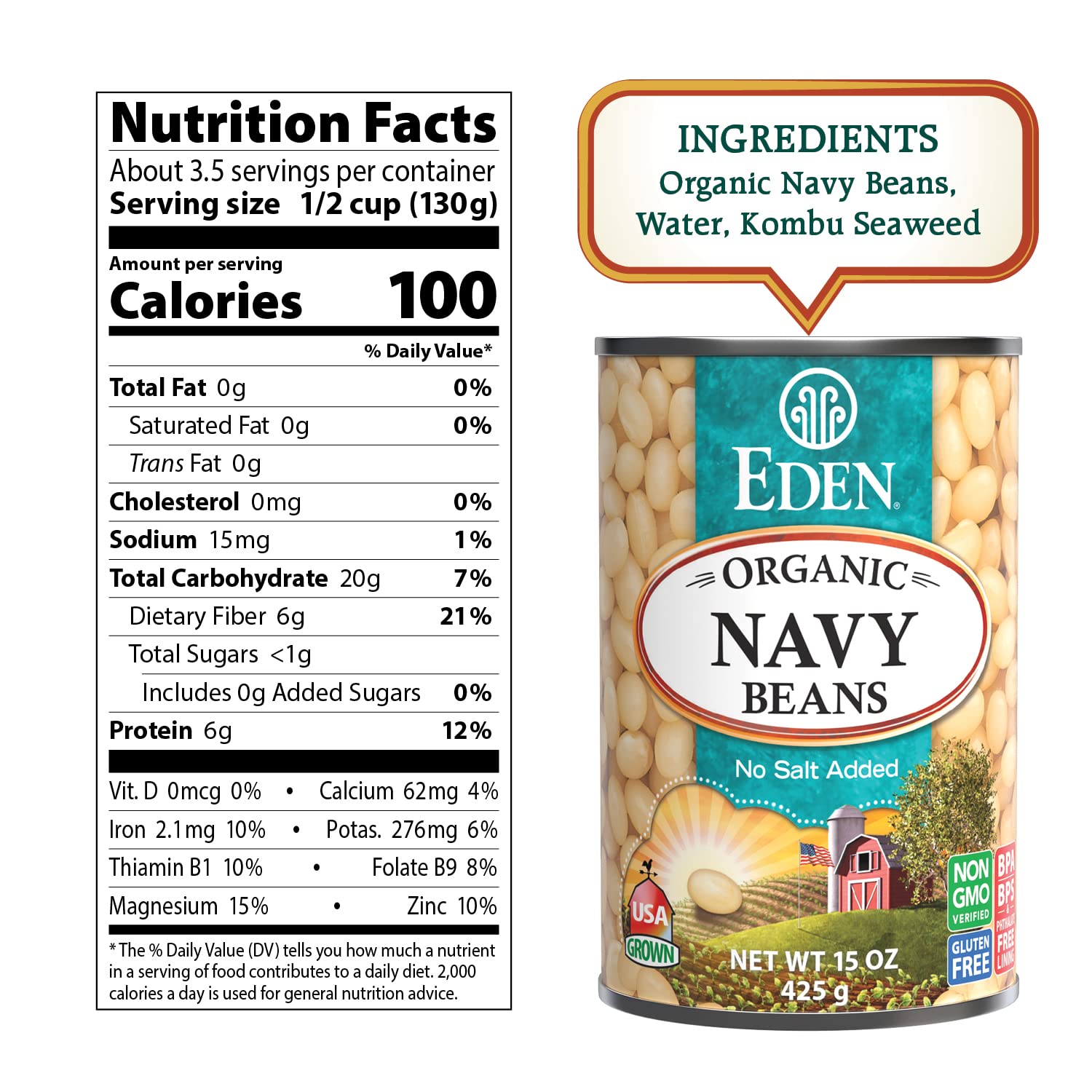 Q: What are the health benefits of Eden Organic Navy Beans?A: Eden Organic Navy Beans are rich in healthy fiber, making them beneficial for digestive health. They are also a good source of protein, iron, thiamin B1, magnesium, and zinc, contributing to overall well-being.