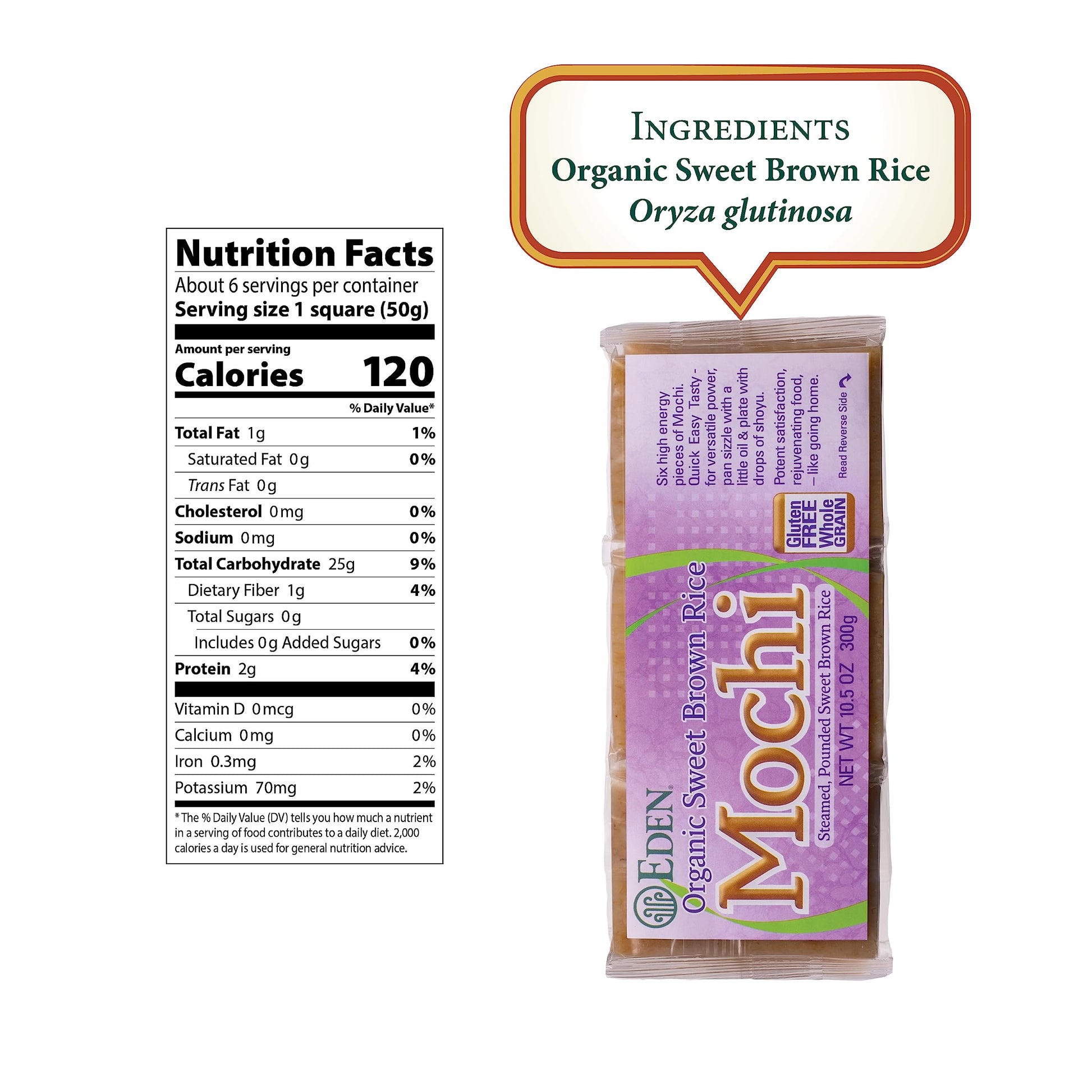 Q: What is Eden Organic Sweet Brown Rice Mochi made of?A: Eden Organic Sweet Brown Rice Mochi is made from 100% certified organic whole grain brown rice, which is steamed and pounded to create a soft and chewy texture.