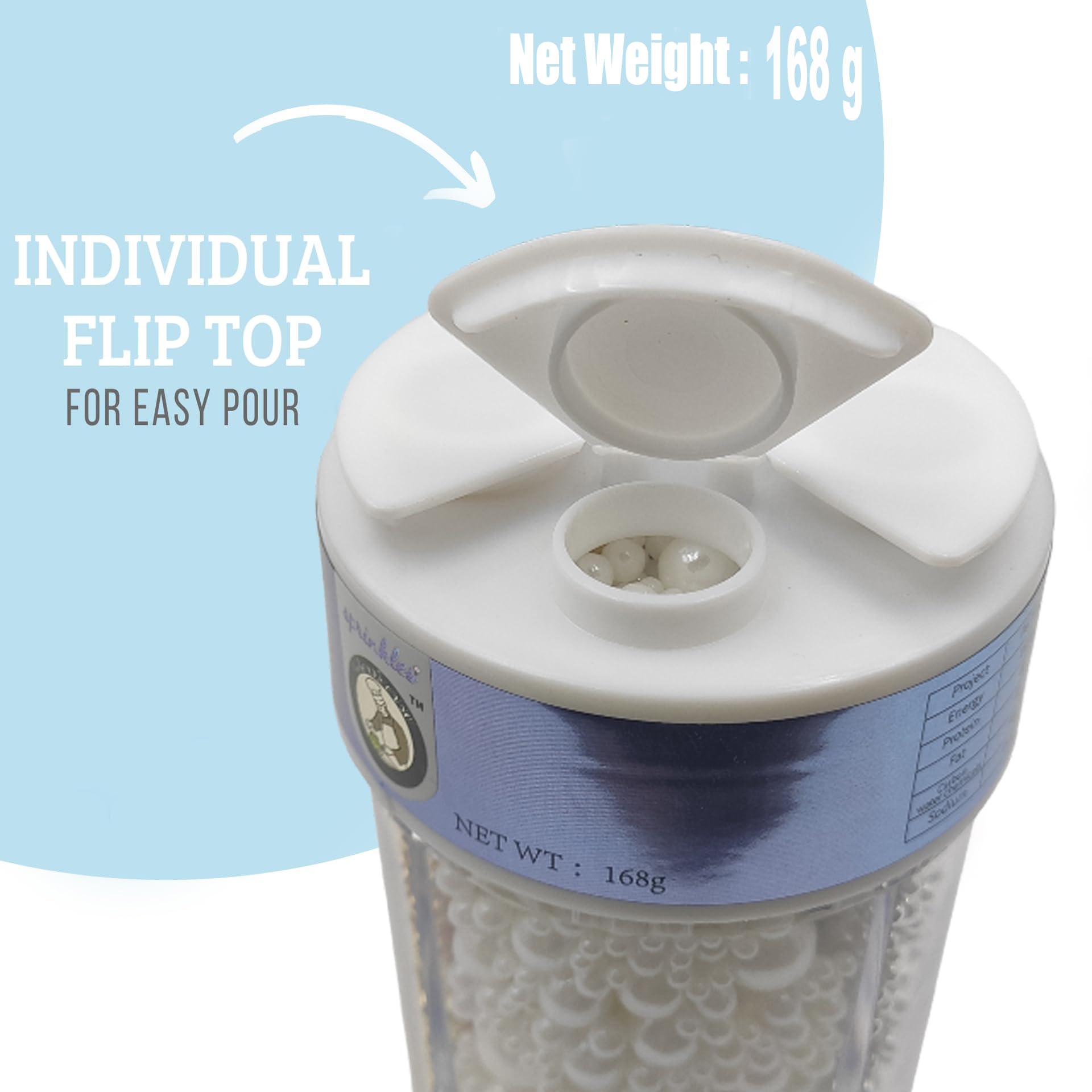 Q: How are the sugar pearls packaged for convenience?A: The Edible 4 in 1 Pearls are conveniently packaged with each pearl size stored in its own sealed compartment featuring a flip-top lid, allowing for easy access and mess-free use.
