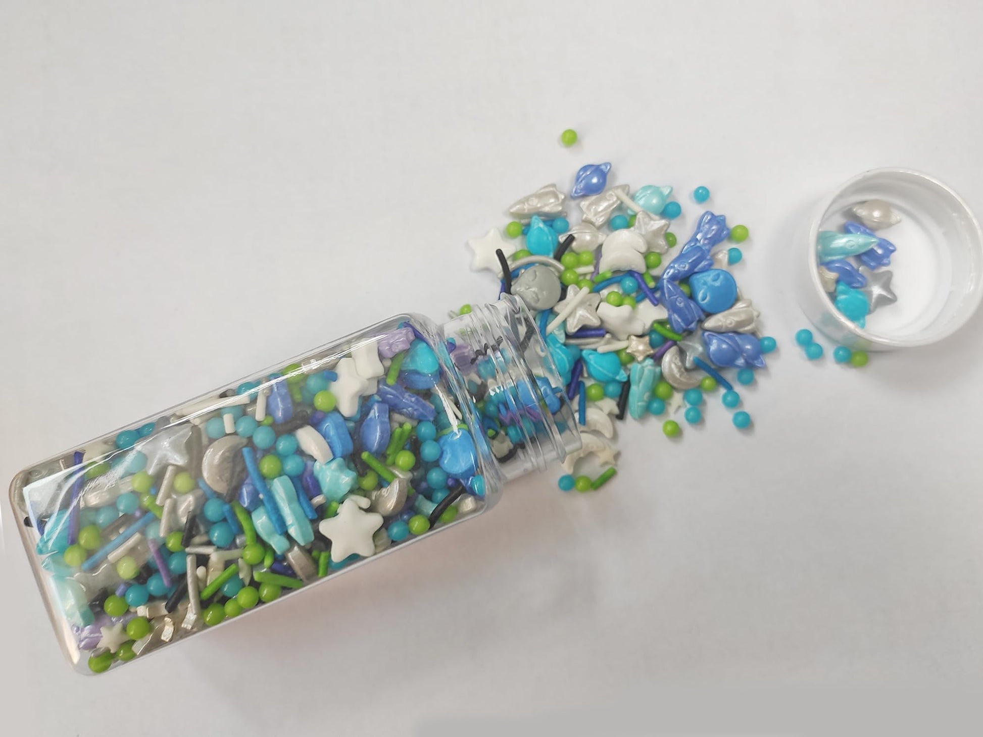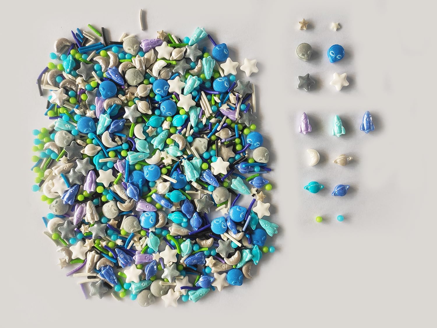 Q: Can these sprinkles be used for all types of desserts?A: Yes, these space-themed sprinkles are versatile and can be used on cakes, cupcakes, cookies, ice cream, and more, adding a fun and decorative touch to any dessert.