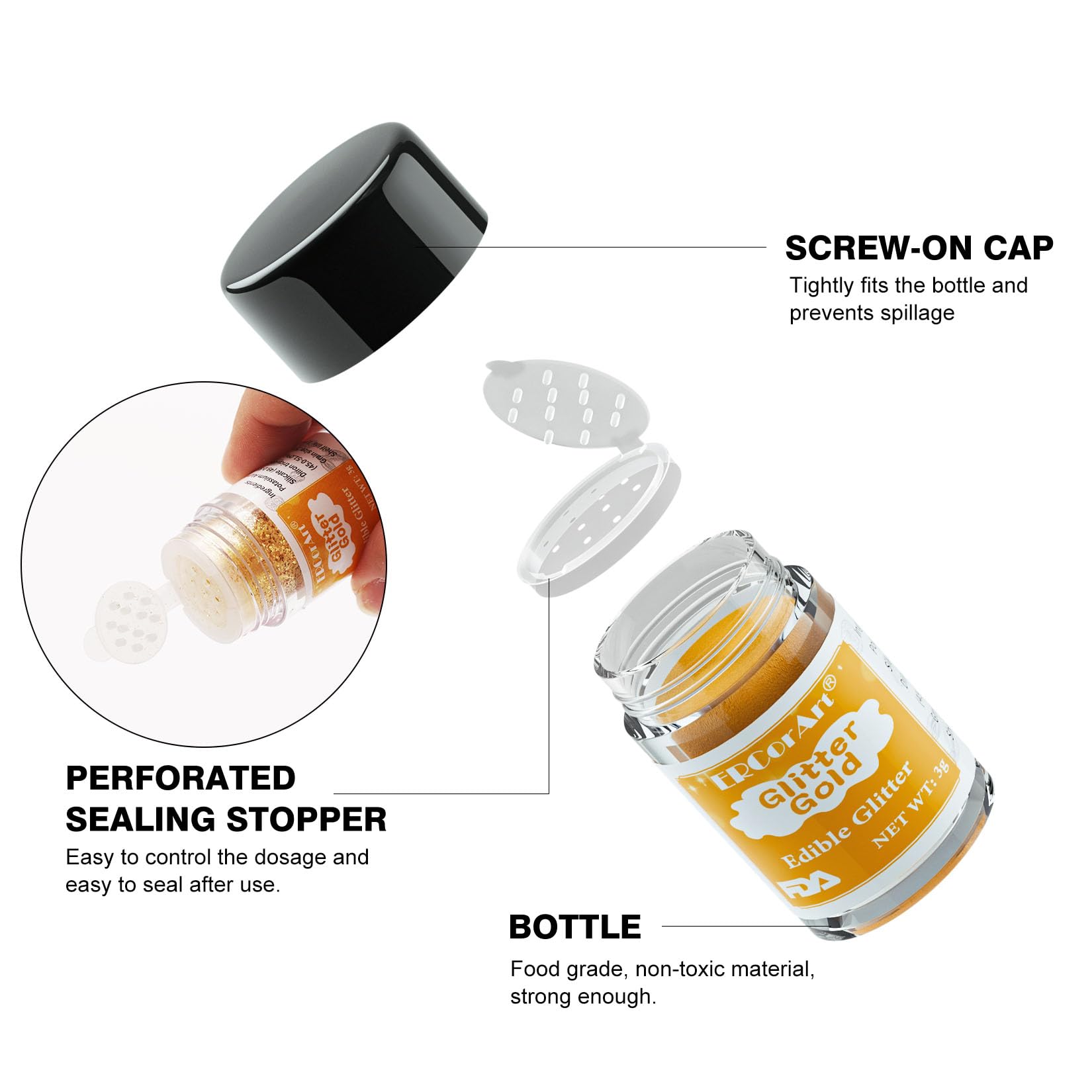 Q: How can I use the Edible Glitter for cake decorating?A: You can easily sprinkle the Edible Glitter on cakes, mix it into drinks, or apply it with a brush on molds for a decorative touch. The unique cap design allows for precise control over the amount used.