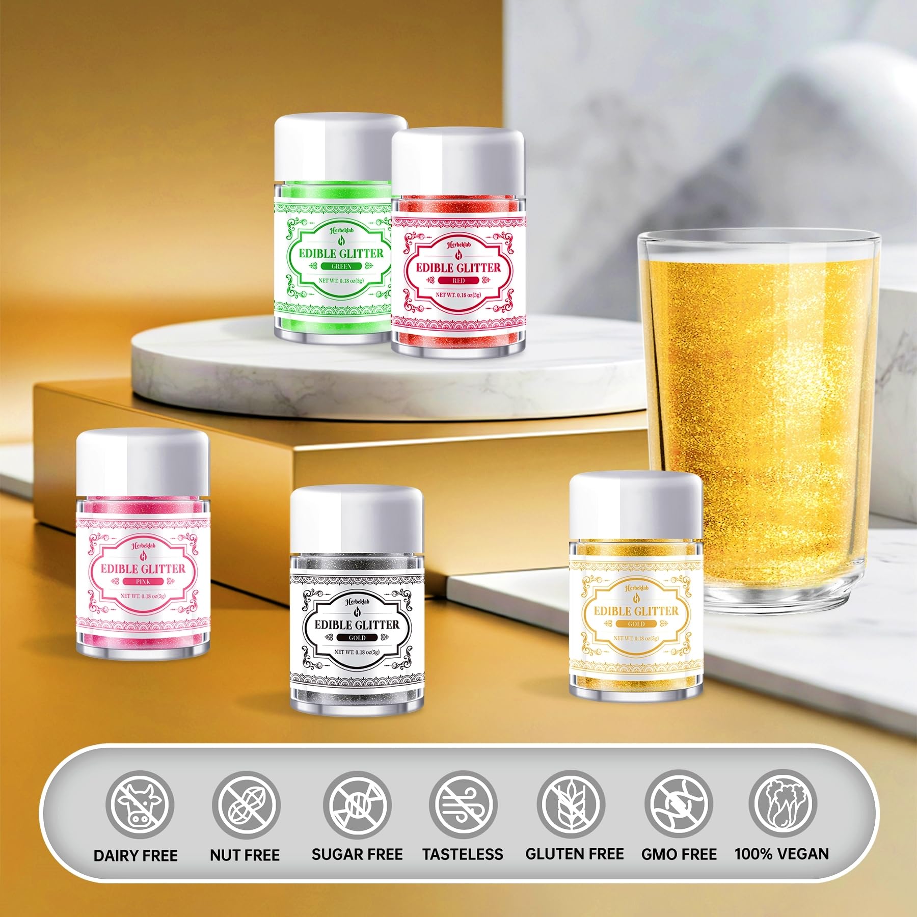 Q: What colors are available in the edible glitter set?A: The edible glitter set includes five vibrant colors: Gold, Black, Red, Pink, and Green, allowing you to enhance a variety of drinks and desserts.