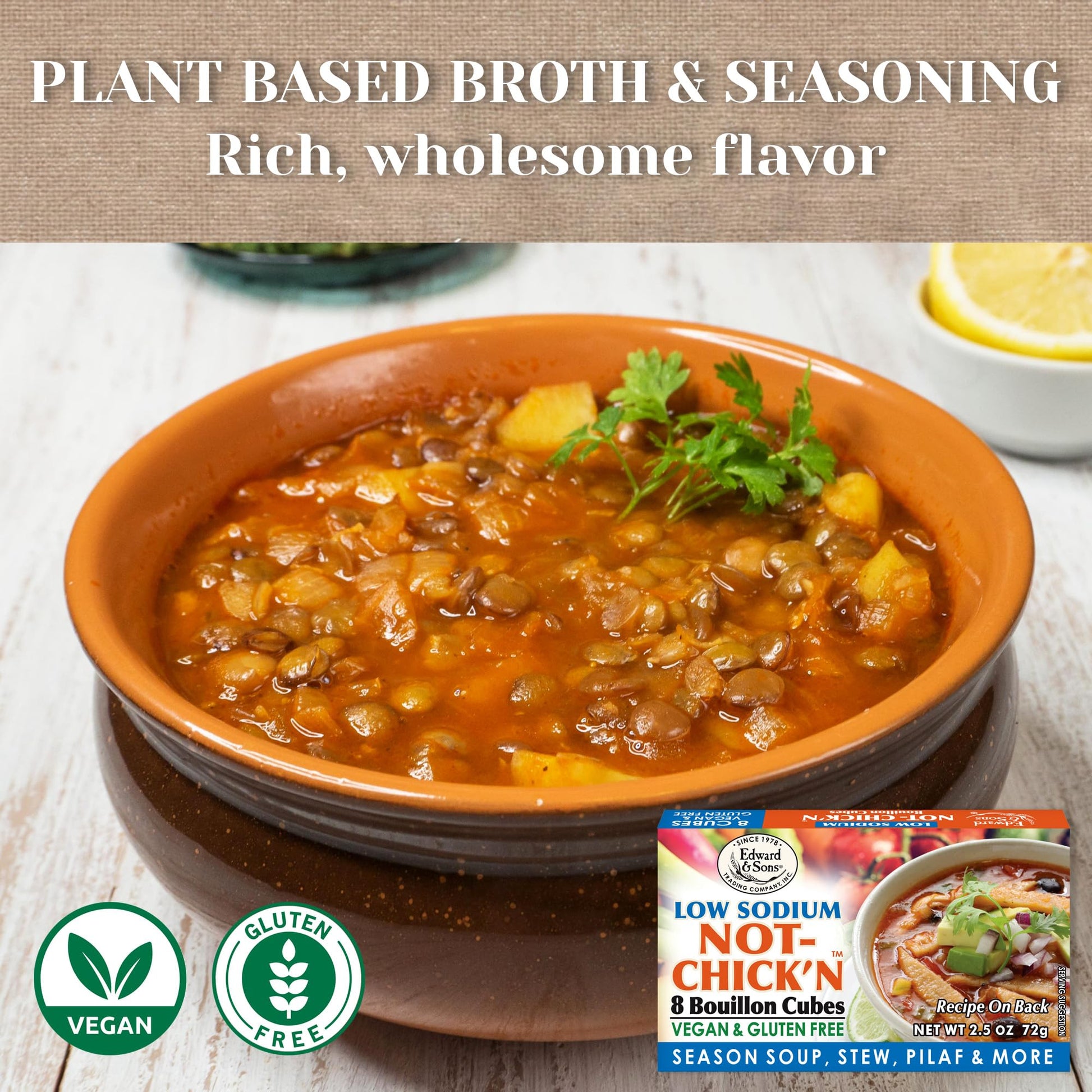 Natural bouillon cube, rich golden broth and seasoning, 125 milligram sodium per serving, season soups, stews and pilafs. Low sodium, vegan and gluten free. Edward & Sons' Natural Bouillon Cubes make wholesome, satisfying broth in seconds with just hot water. Just mix with hot water for delicious flavored broth, or add to soups, stews and sauces as the chef's secret seasoning. Our vegan cubes are the first to offer the comfort of Not-Chick'n and Not-Beef flavor profiles. Or choose a more traditional Garden Vegetable cube with or without added salt.