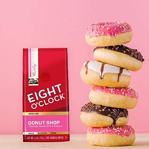 Q: What is the flavor profile of Eight O'Clock Coffee Donut Shop?A: Eight O'Clock Coffee Donut Shop offers a classically smooth flavor with well-balanced notes, making it a perfect match for sweet treats like glazed donuts.