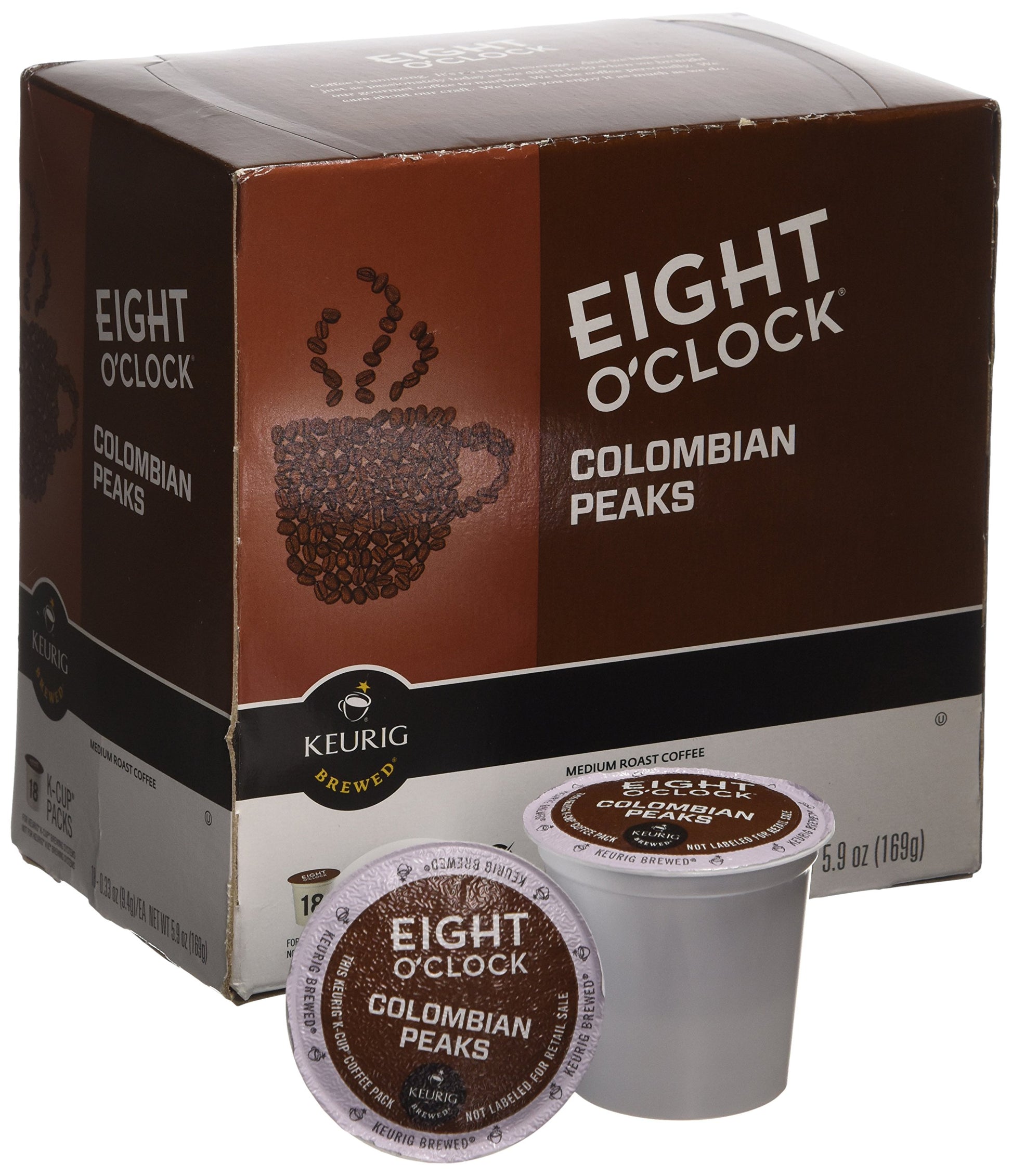 Eight O'Clock 100% Colombian Medium Roast Coffee 18 K-Cup Packs. Keurig Brewed. For Keurig K-Cup Brewing Systems. Not For Keurig Vue Brewing Systems. 18 - 0.33 Oz (9.4G) /Ea Net Wt 5.9 Oz (169G)