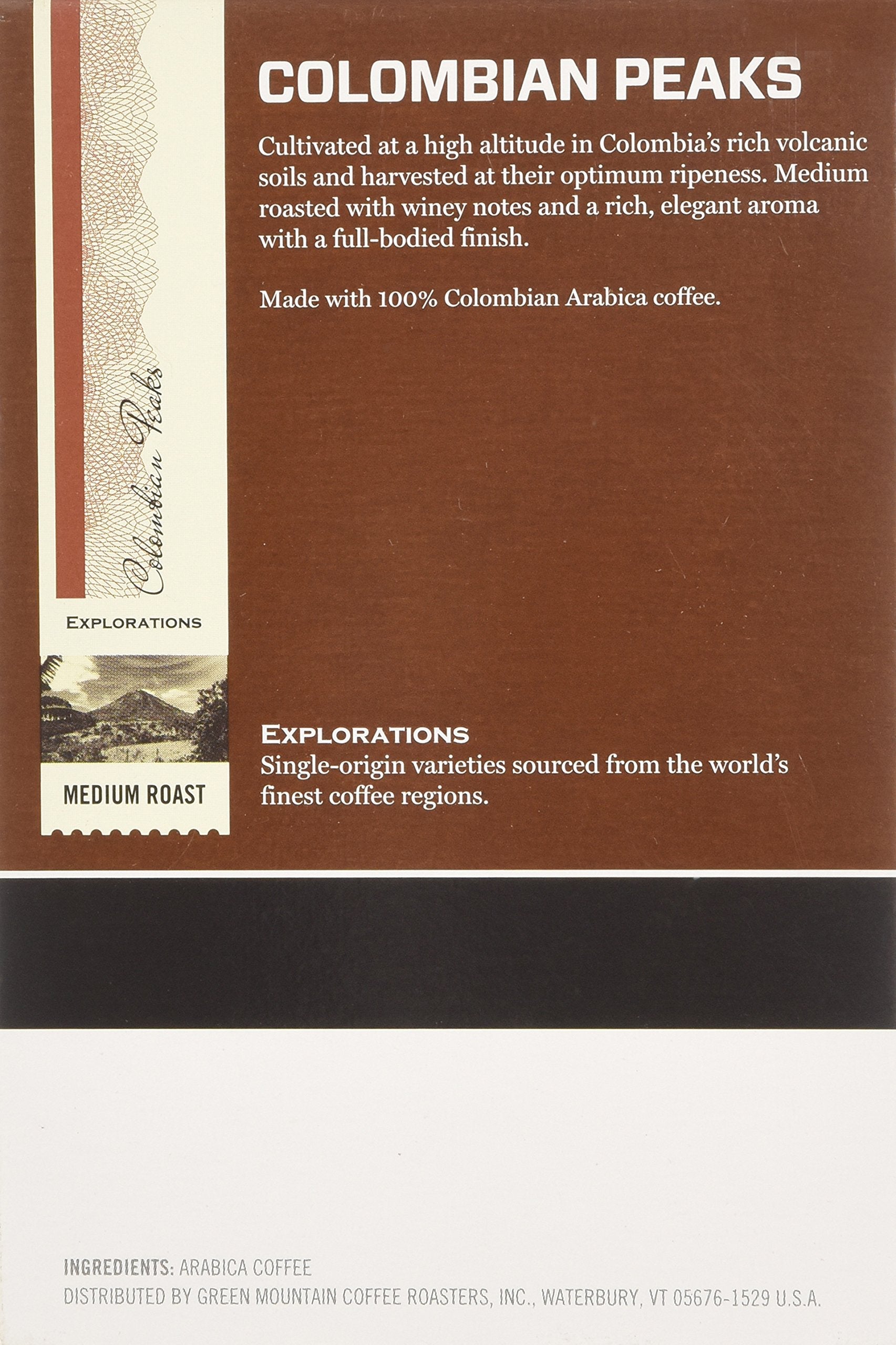 Q: What type of coffee is the Eight O'Clock Colombian Peaks Medium Roast?A: The Eight O'Clock Colombian Peaks is a 100% Colombian medium roast coffee, known for its winey notes and rich aroma.