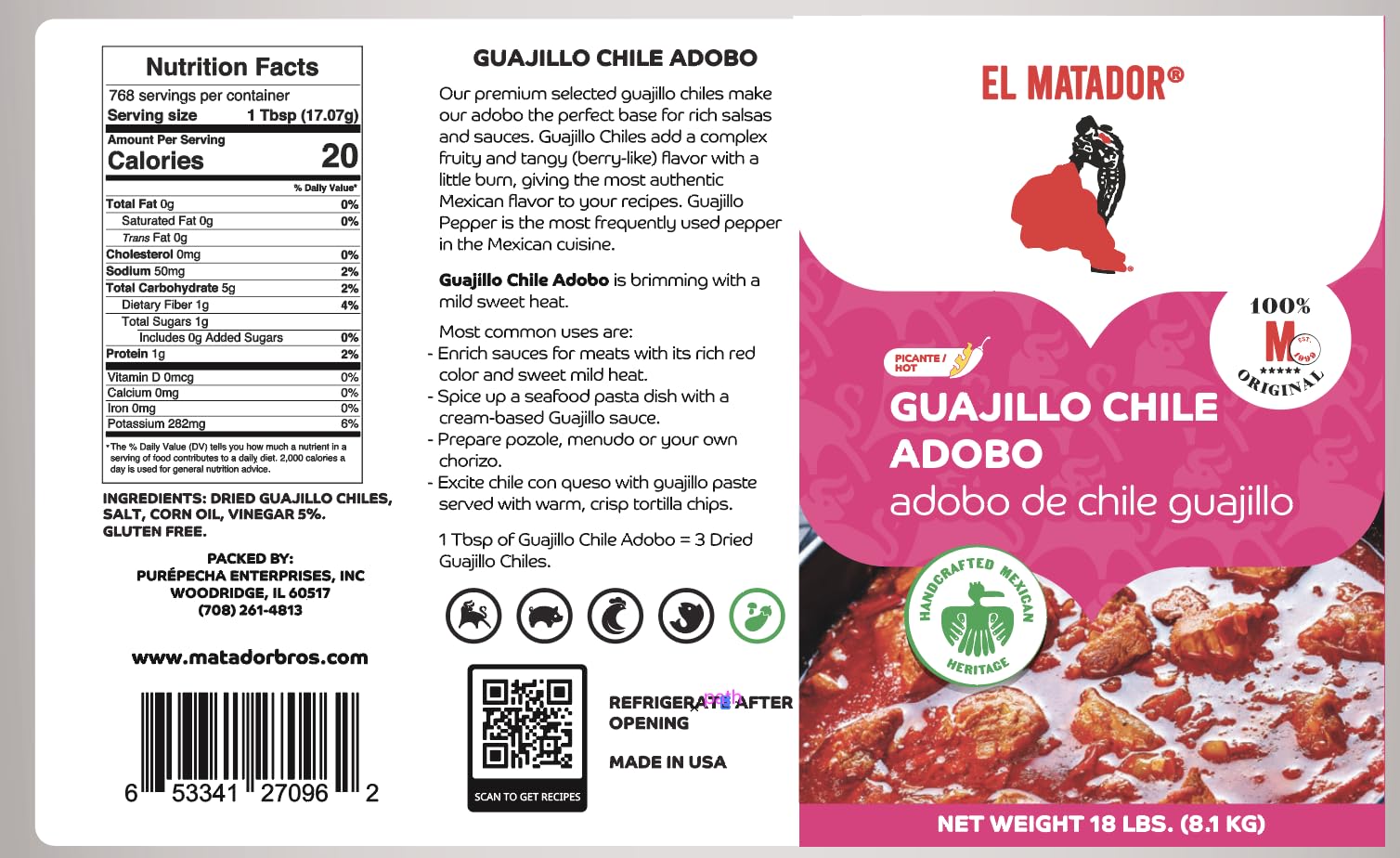 El Matador Guajillo Chile Adobo Paste captures the sweet-tart character of sun-dried guajillo chiles. Expect berry-like brightness, gentle warmth and a vibrant brick-red color in a paste that goes straight from pail to pan-no soaking or blending dried pods required. Spoon it into broths and salsas, whisk with stock, oil or citrus for marinades, or finish dishes for a clean pop of chile flavor. From pozole rojo, birria and enchiladas to seafood, veggies and house-made chorizo, this paste delivers consistent, scratch-quality results service after service.Packed in an 18-lb, resealable, tamper-evident pail built for busy restaurant kitchens, taquer as and caterers.