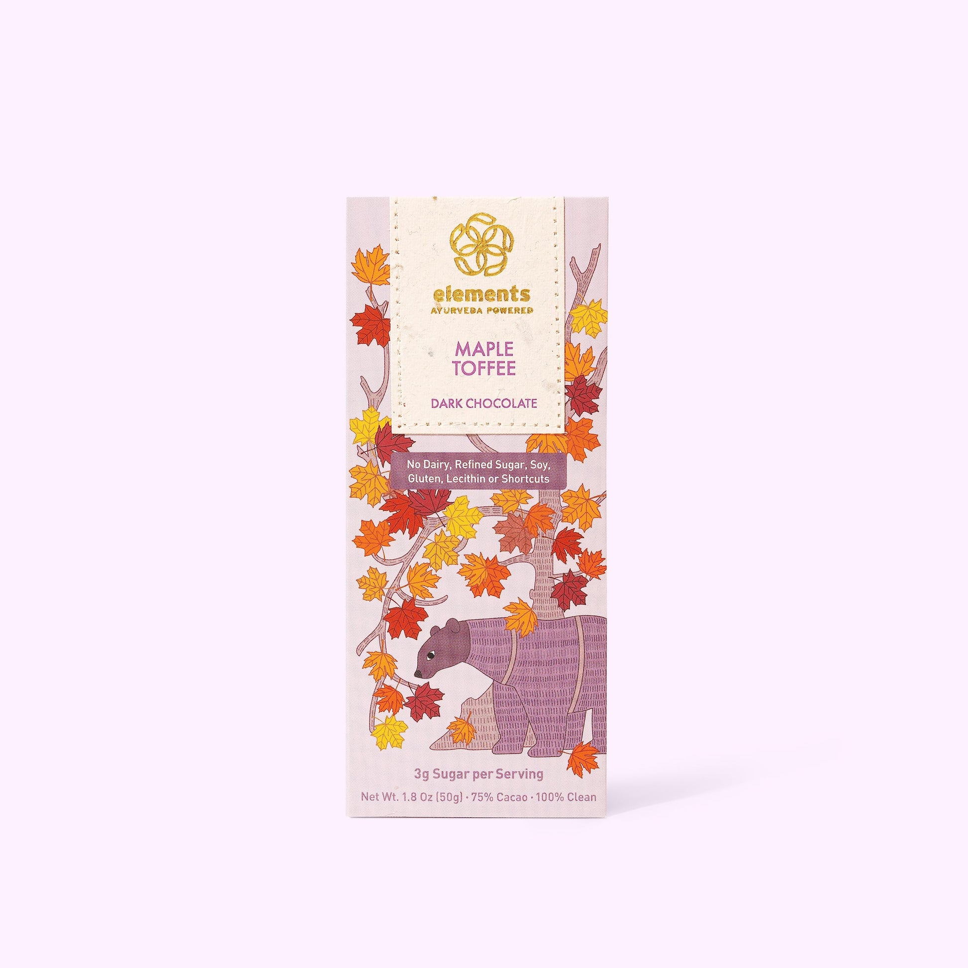 - Q: What are the main ingredients in Elements Truffles Maple Toffee with Moringa? A: Elements Truffles Maple Toffee with Moringa is made from high-quality ingredients including organic cacao butter, Vermont maple syrup reduction, and Asian moringa. It is sweetened with raw, local honey and contains no refined sugars or synthetic sweeteners.