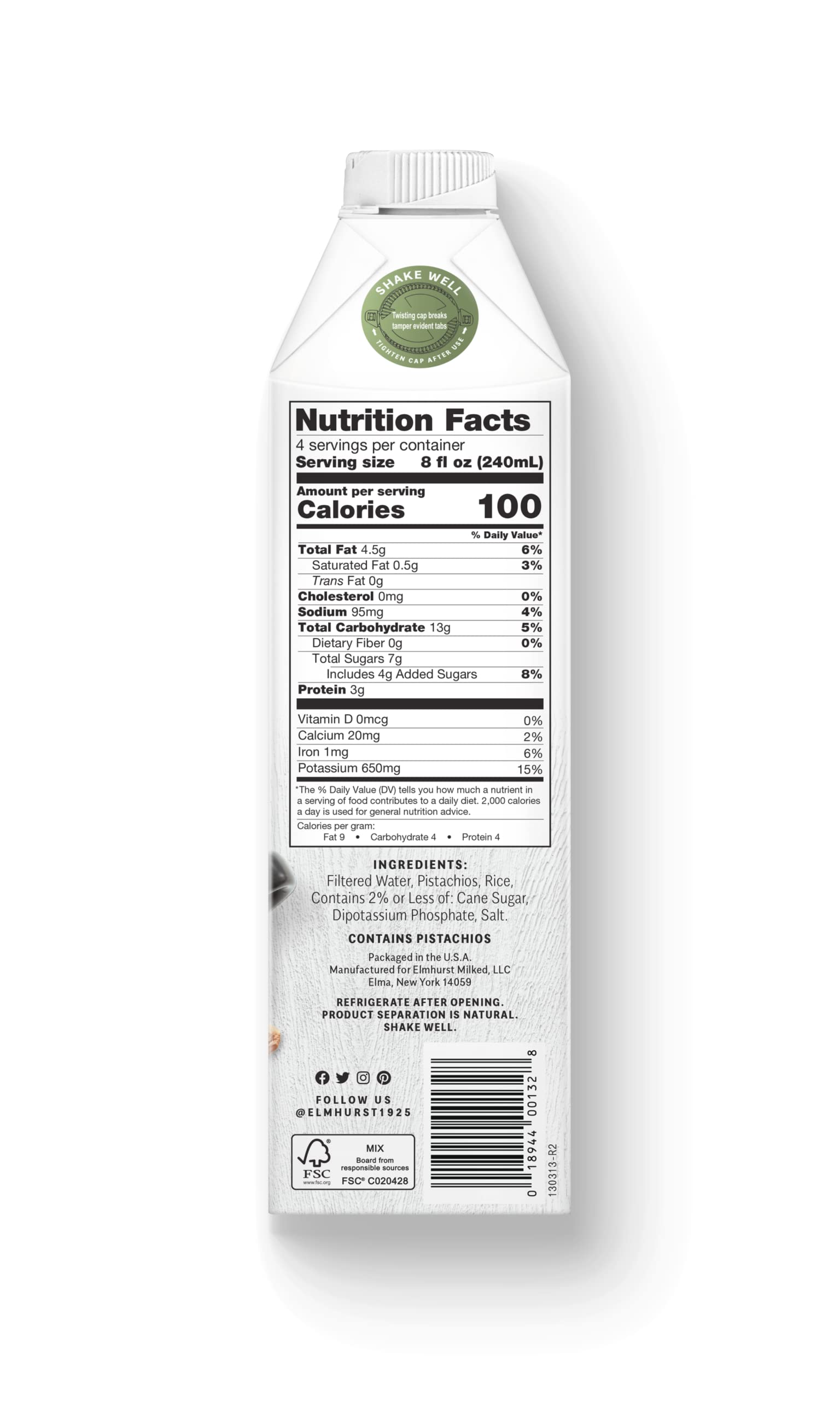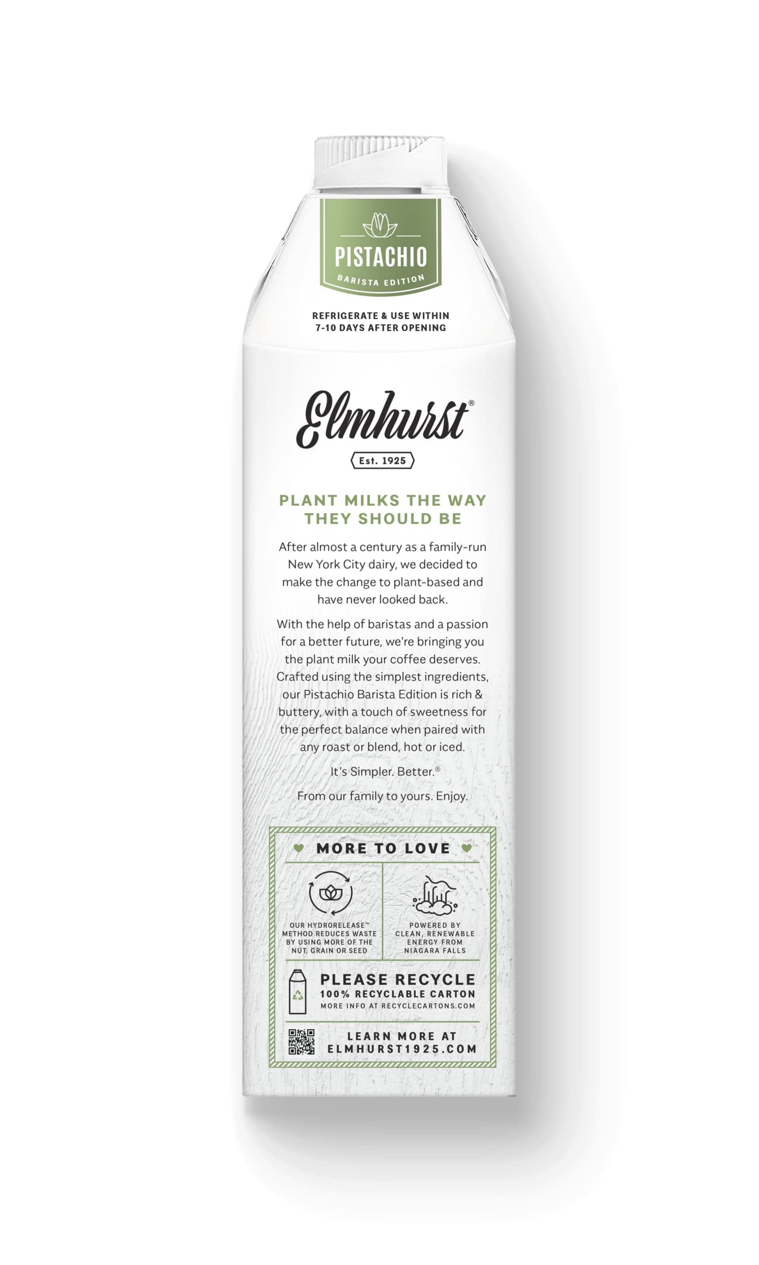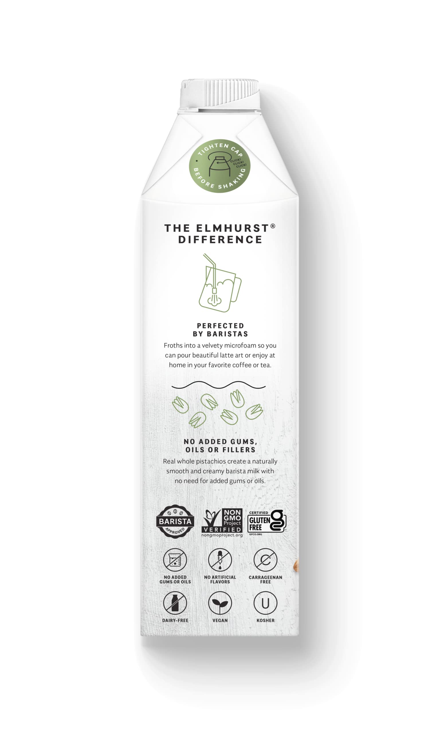 - Q: What makes Elmhurst 1925 Barista Edition Pistachio Milk different from other plant-based milks? A: Elmhurst 1925 Barista Edition Pistachio Milk is uniquely crafted using a HydroRelease method, which blends raw pistachios with rice to create a creamy, dairy-free milk. It is free from gums, oils, and fillers, ensuring a rich, buttery taste that enhances your coffee experience.