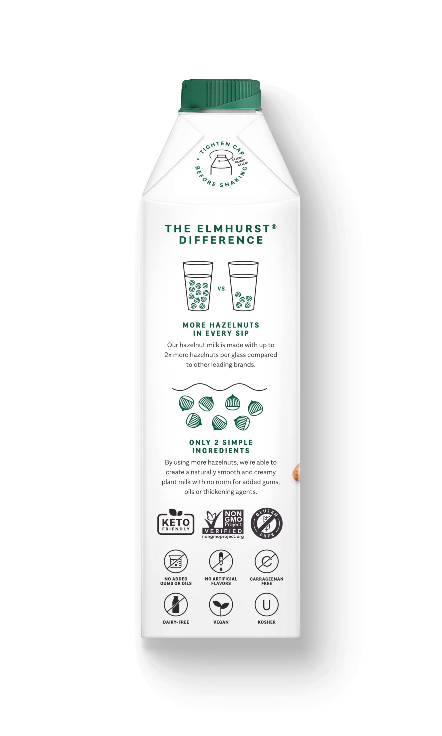 Q: What nutritional benefits does Elmhurst Hazelnut Milk provide?A: Elmhurst Hazelnut Milk is a good source of Vitamin E and is crafted using the HydroRelease method, ensuring a nutritious and delicious dairy-free option.
