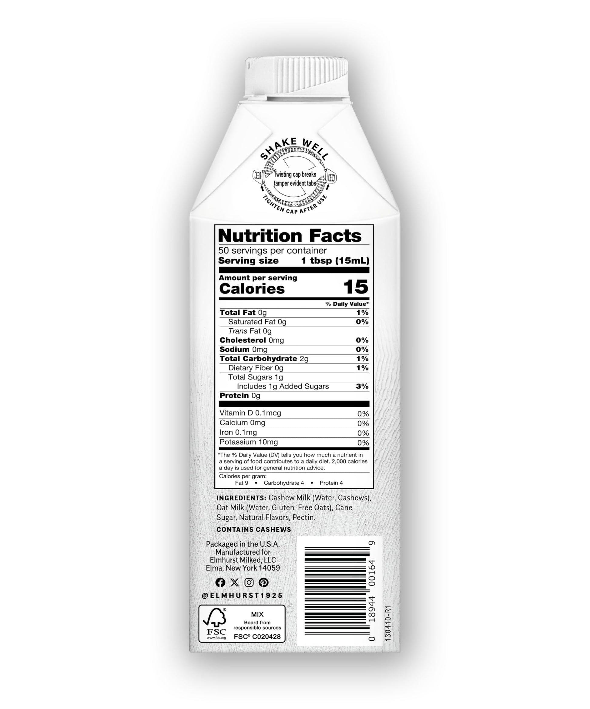 Q: What are the main ingredients in Elmhurst Milked Caramel Brulee Cashew Creamer?A: Elmhurst Milked Caramel Brulee Cashew Creamer is crafted with whole cashews, gluten-free oats, and features notes of toasted caramel and crème brûlée. It is made with just 6 simple ingredients and is free from gums, oils, and fillers.