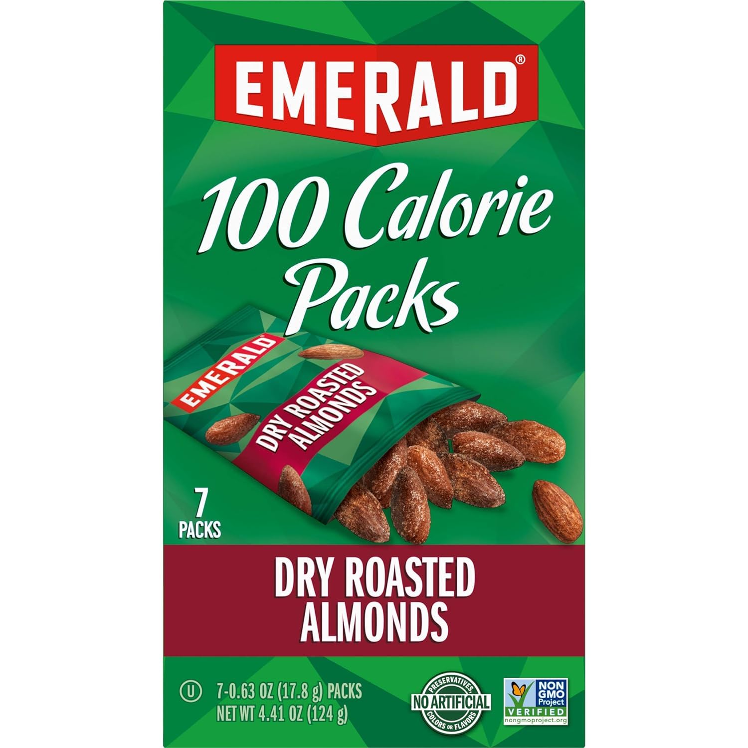 - Q: How many calories are in each pack of Emerald Nuts Dry Roasted Almonds? A: Each pack contains one hundred calories, making it a convenient option for portion control and snacking.