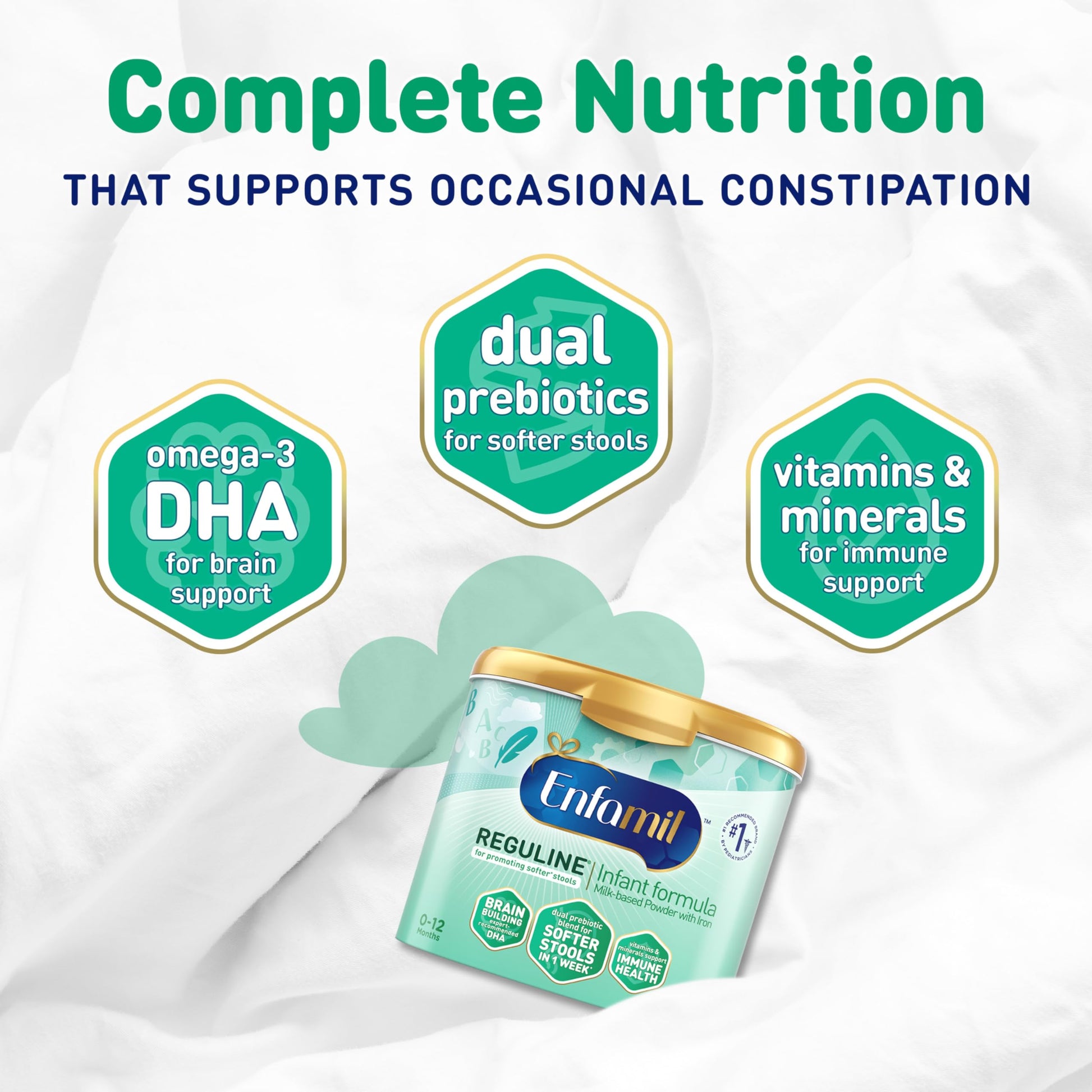 - Q: What are the benefits of using Enfamil Reguline baby formula? A: Enfamil Reguline baby formula is designed to promote softer, more comfortable stools within one week of use thanks to its dual-prebiotics. It also includes DHA for brain development and a blend of immune-supporting nutrients, providing complete nutrition for babies up to 12 months.