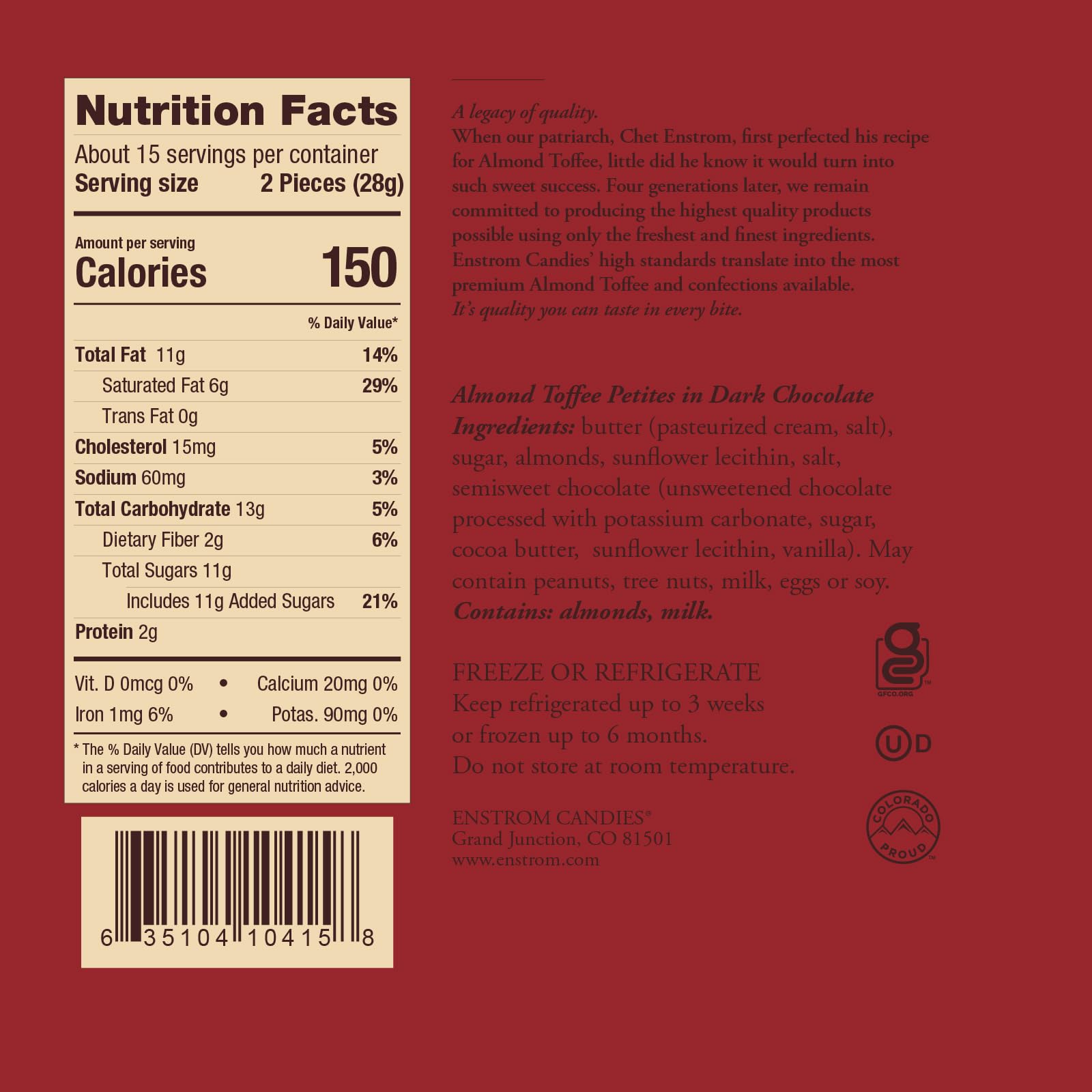 Q: Is the Enstrom Dark Chocolate Almond Toffee gluten-free?A: Yes, Enstrom Dark Chocolate Almond Toffee is certified gluten-free, making it a suitable snack for those with gluten sensitivities.
