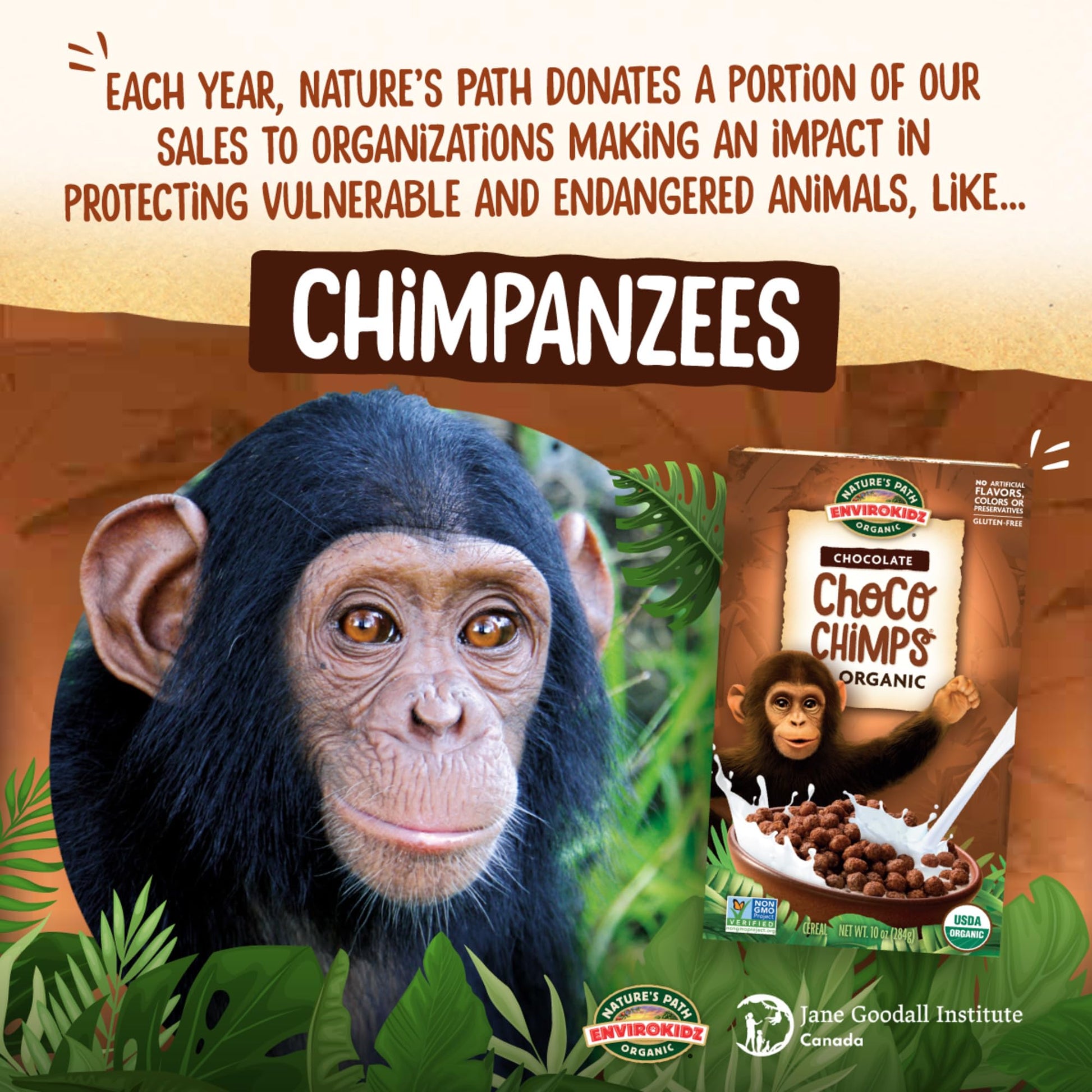 Q: What makes EnviroKidz Choco Chimps different from other kids' cereals?A: EnviroKidz Choco Chimps stands out due to its commitment to nutrition and sustainability, using only organic ingredients and supporting habitat conservation for endangered species.