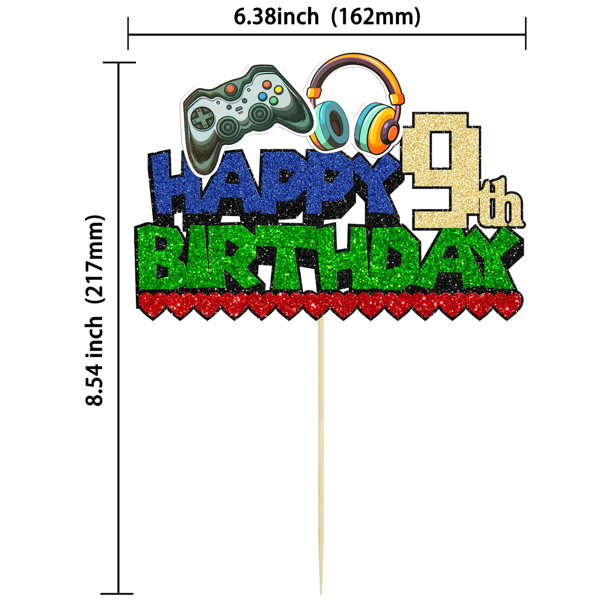 Q: What material is the Ephlyn Video Game Happy 9th Birthday Cake Topper made of?A: The Ephlyn Video Game Happy 9th Birthday Cake Topper is made of high-quality paper material, specifically 300 gram glitter thick cardstock, which is durable and designed for long-lasting use.