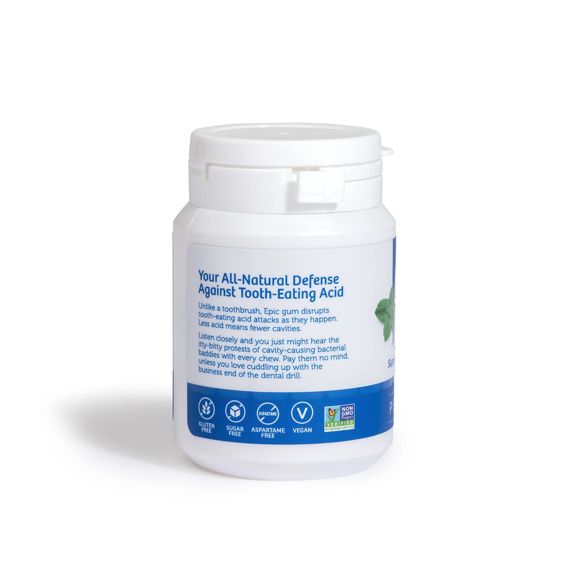 Finding a sugar-free gum that satisfies your cravings and helps stop tooth decay and dry mouth? Not as impossible as you'd think... Sugarless, aspartame-free and sweetened exclusively with Xylitol, Epic Chewing Gum delivers a great tasting product while helping you get the daily 6 grams of Xylitol recommended by dentists worldwide. Each piece of Epic Xylitol gum contains 1.06 grams of Xylitol. That's enough to really pack a punch and helps you easily reach your daily recommended amount of xylitol (6g - 10g per day). Not only does Epic gum taste great but it can help fight tooth decay, supports healthy gums, freshens bad breath and helps reduce dry mouth. Plus, with all natural Gluten-Free, Non-GMO, Vegan ingredients, you can confidently use it as a safe candy alternative for your kids. Epic gum is available in a variety of savory choices, but you simply can't go wrong with our Peppermint flavor. Sure, we have other flavors, too, but Peppermint has always been a classic among gum chewers. Packaged in 3 convenient Bottles with 50 pieces each, this gum stores easily, stays fresh and offers plenty to share!