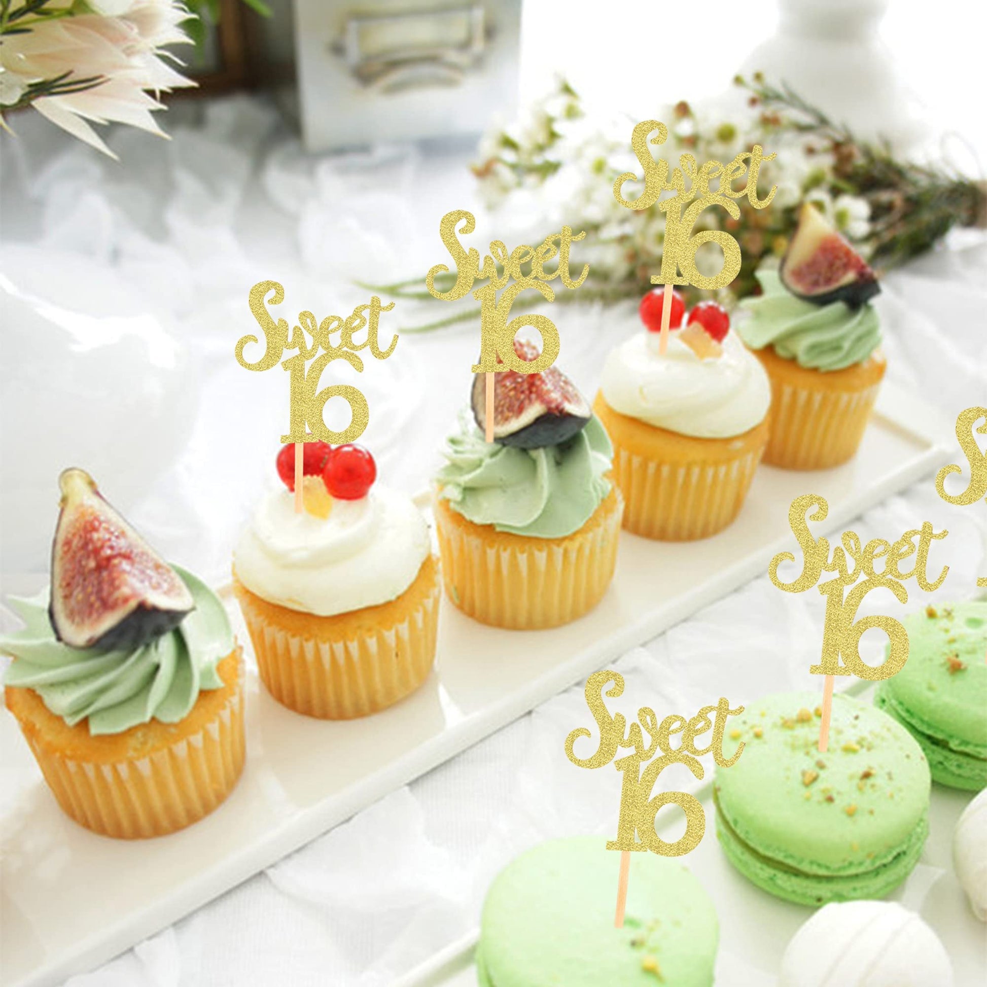 Q: What are the dimensions of the Ercadio Sweet 16 Cupcake Toppers?A: The Ercadio Sweet 16 Cupcake Toppers measure H 13.6cm * W 5.5cm, or approximately H 5.4 inches * W 2.2 inches, including the stick.