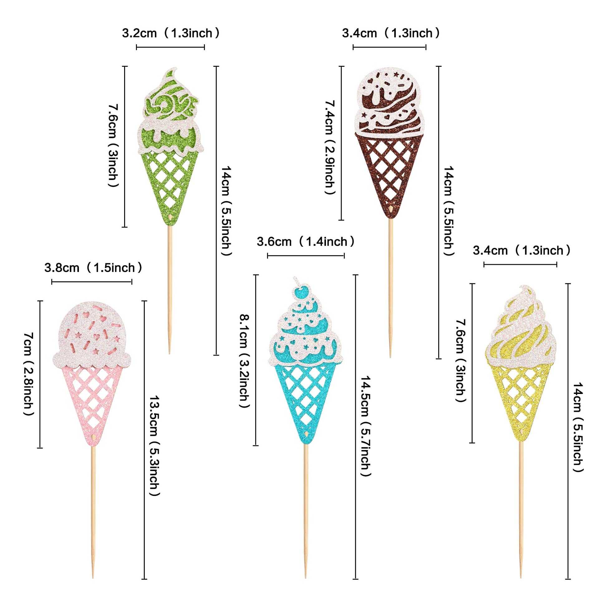 Q: What is the size of the cupcake toppers?A: The Ercadio Ice Cream Cupcake Toppers measure 14.3cm in height (including the stick) and 3.7cm in width, which is approximately 5.6 inches by 1.5 inches, making them a prominent addition to your desserts.
