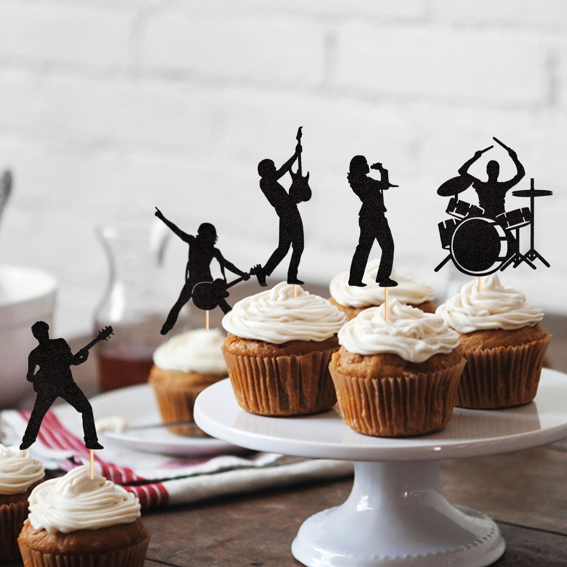 Q: What are Ercadio Rock Band Cupcake Toppers made of?A: Ercadio Rock Band Cupcake Toppers are made from high-quality 300g cardboard and feature food-grade toothpick sticks, ensuring they are safe for use with food.