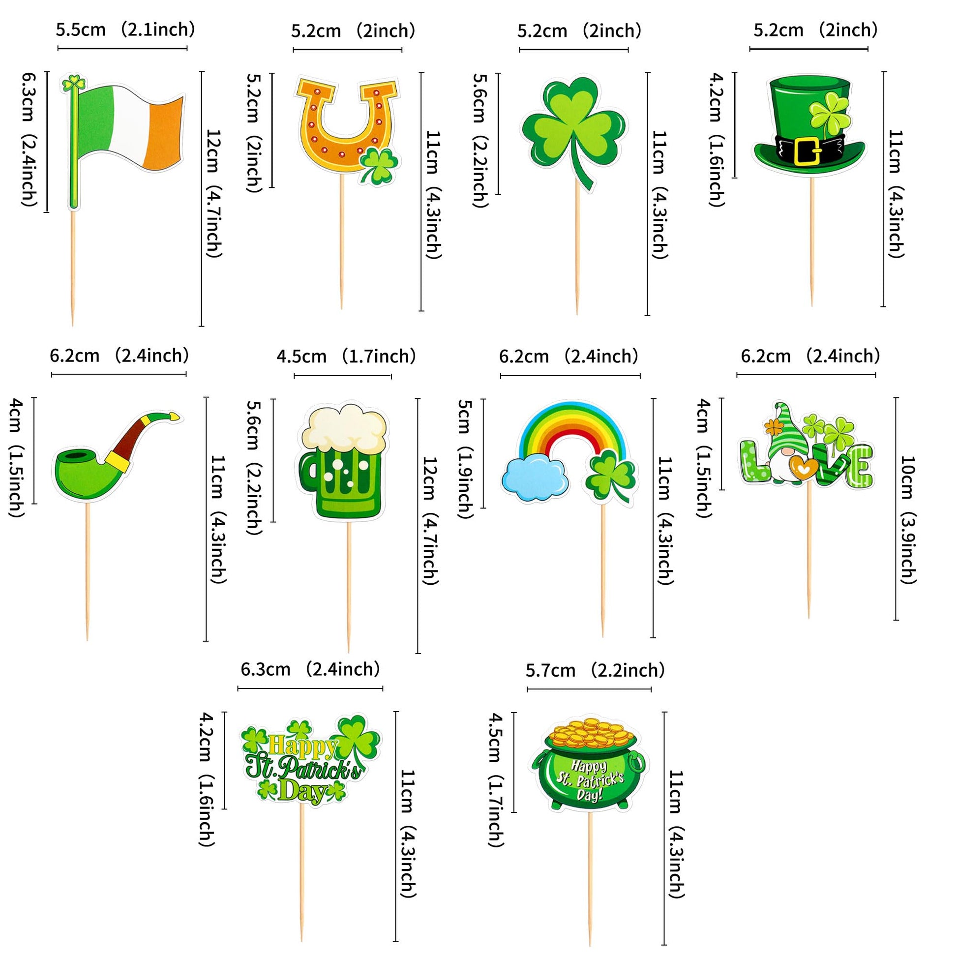 Q: How many cupcake toppers are included in a package?A: Each package contains 36 cupcake toppers, with 6 pieces of each design. This variety allows you to create a festive atmosphere for your St Patrick's Day theme party.