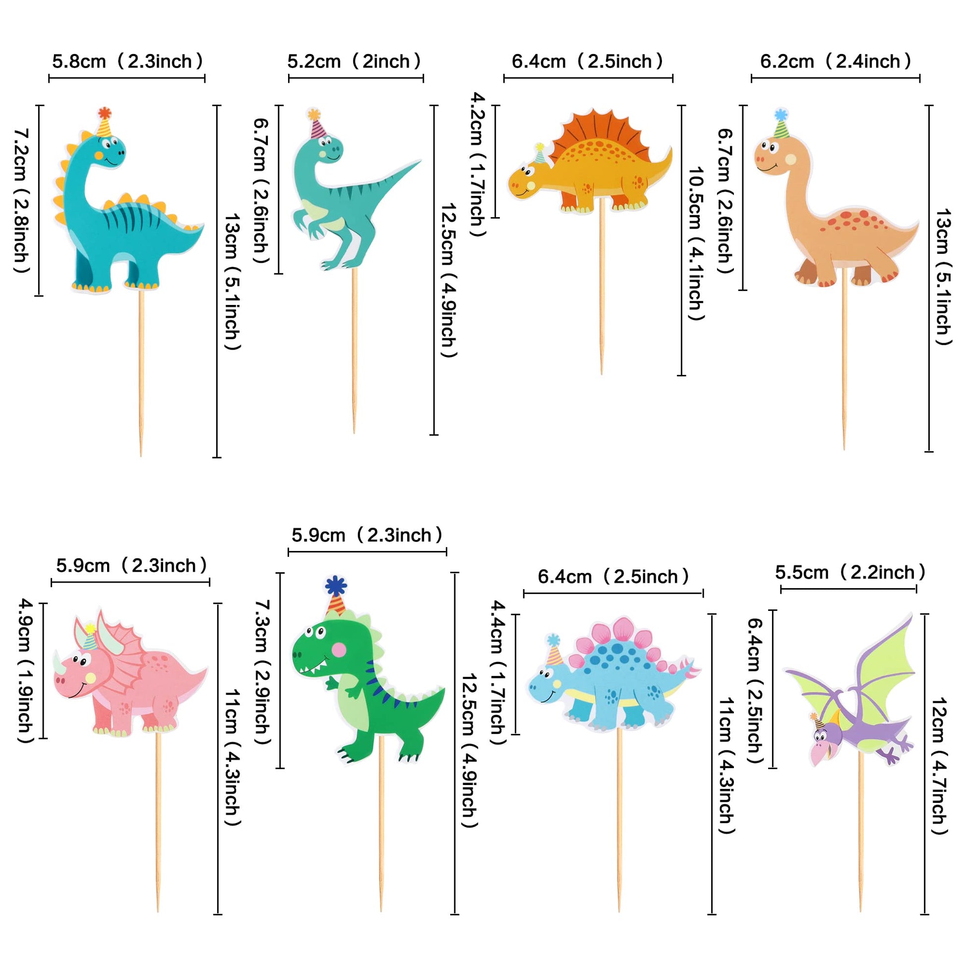 -Material: High quality 300g glitter cardboard with food grade toothpick sticks. -Package includes: 32pcs dinosaur cupcake toppers.8 designs and each for 4 pcs. -Perfect for : dinosaur themed parties, birthday party supplies, baking interest group, family reunion dinner,cake decor, ice cream cake ornaments ,baby shower, garden parties..... -Great accessory for cupcakes,cakes,ice cream,fruit,dessert,cheese,and any food you want to dress up. -Enjoy baking happy time with friends and family . - Friendly Reminder:Designed for single-sided,another side is plain white. If you have any problems,please contact us, we will try our best to solve your problem within 24 hours.