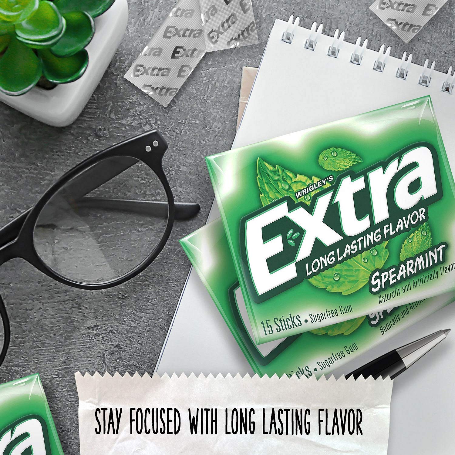 Q: How long does the flavor of Extra Spearmint Gum last?A: The flavor of Extra Spearmint Sugar-Free Gum is designed to provide invigorating freshness that lasts, giving you a crisp and refreshing experience with each chew.