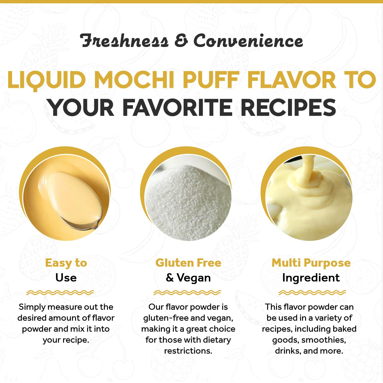 Q: Is the Golden Liquid Mochi Puff Powder gluten-free and vegan?A: Yes, our Golden Liquid Mochi Puff Powder is gluten-free and vegan, making it suitable for individuals with dietary restrictions or those following plant-based diets.