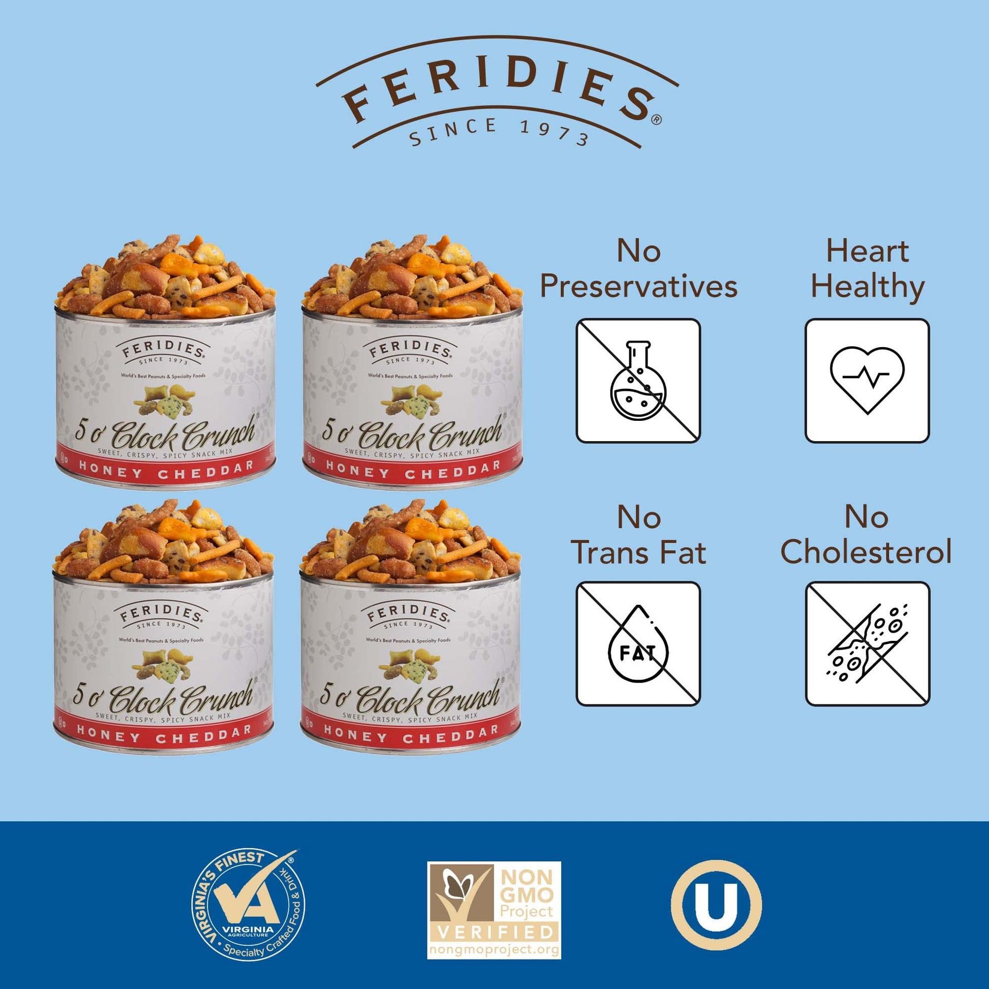 Q: Is FERIDIES Honey Cheddar 5 o'Clock Crunch a healthy snack option?A: Yes, this snack mix is a healthy choice as it contains no preservatives, no cholesterol, and no trans fats. It's made with Virginia peanuts, which are a great source of protein, vitamins, and minerals.