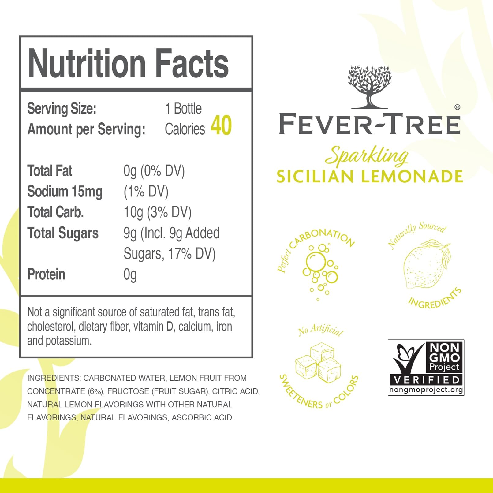 - Q: What are the key ingredients in Fever Tree Sparkling Sicilian Lemonade? A: Fever Tree Sparkling Sicilian Lemonade is made with naturally sourced Sicilian lemons, including 'Sfumatrice-Torchio' extracts, and contains no artificial sweeteners or colors. The blend includes spring water, fruit juice, and oils from the peel of Sicilian lemons, creating a refreshing and balanced flavor.