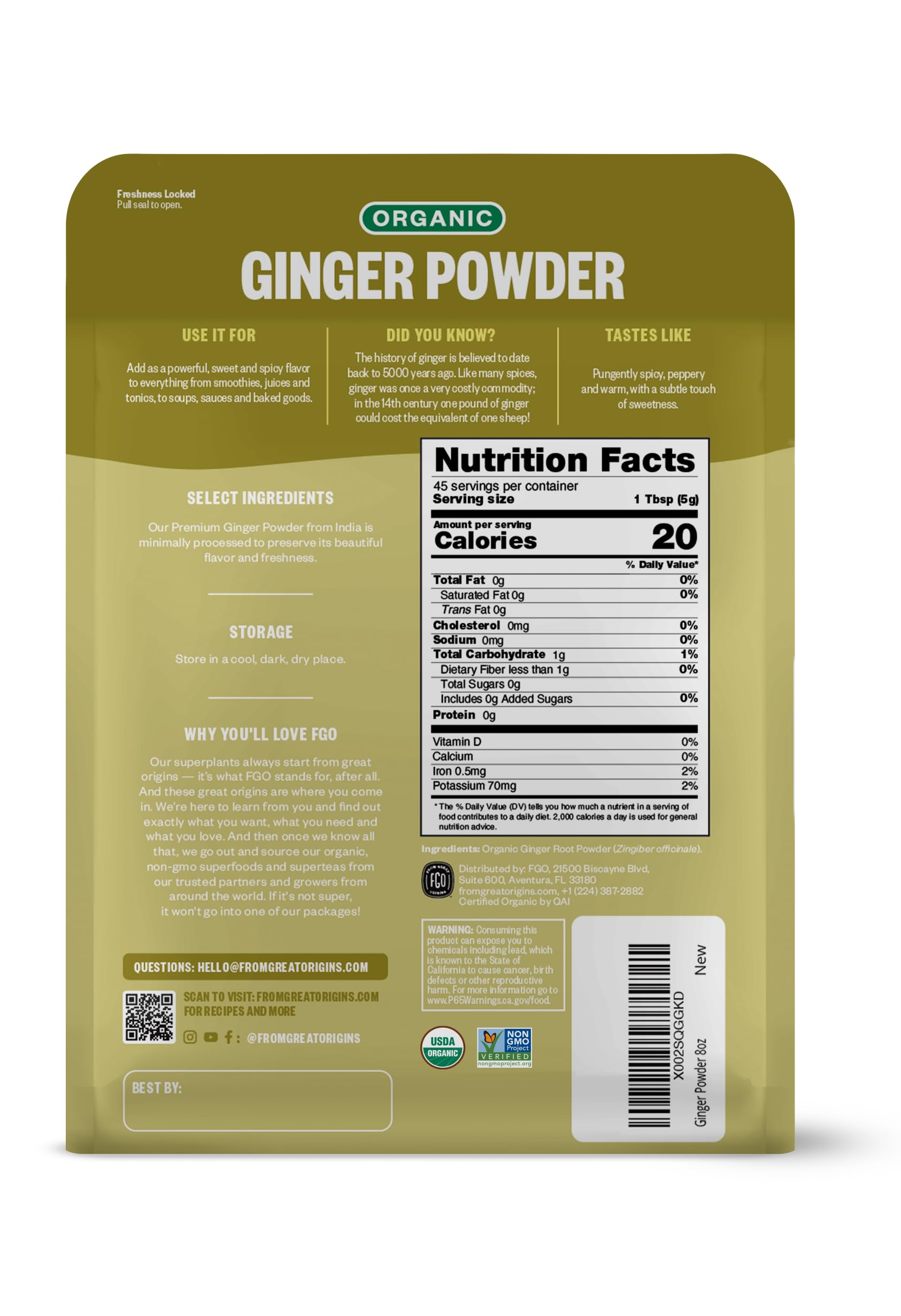 - Q: Is this ginger powder certified organic? A: Yes, FGO Organic Ginger Powder is certified USDA Organic by California Certified Organic Farmers (CCOF). This ensures that the product meets strict organic farming standards and is free from harmful chemicals.