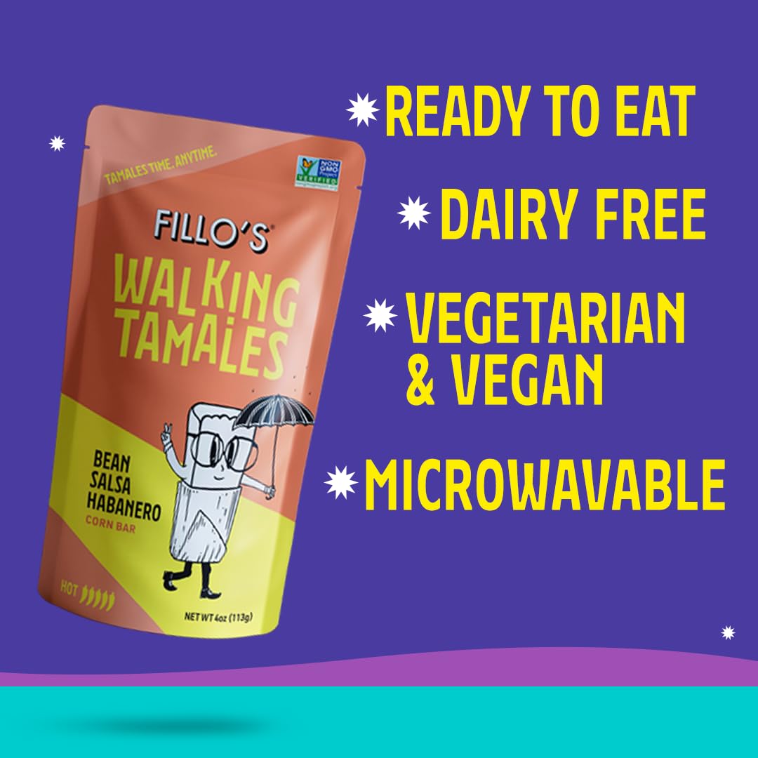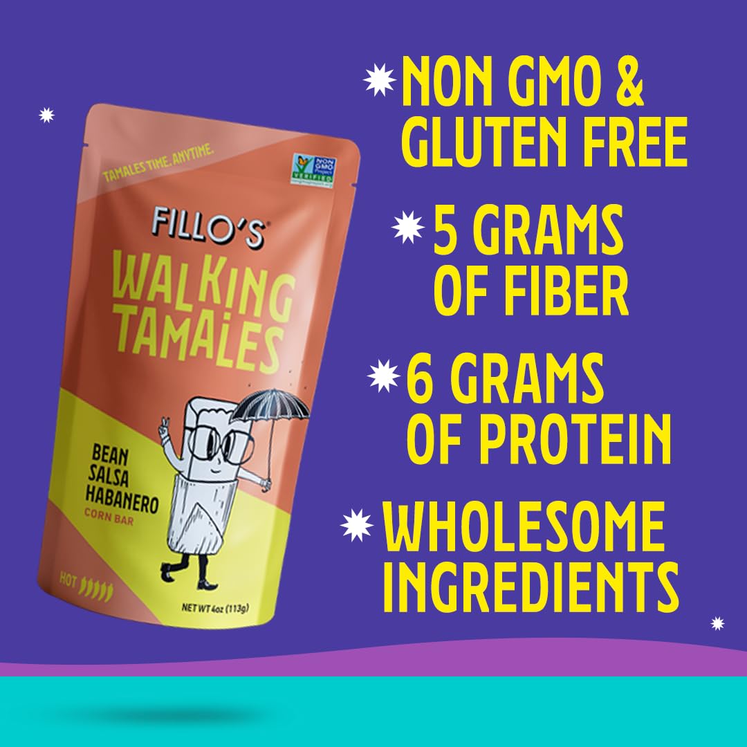 Q: What are Fillo's Walking Tamales Salsa Habanero made of?A: Fillo's Walking Tamales Salsa Habanero are made with clean-label, Non-GMO ingredients including beans, fresh vegetables, nixmalized white corn, and extra virgin olive oil, ensuring a delicious and healthy option.
