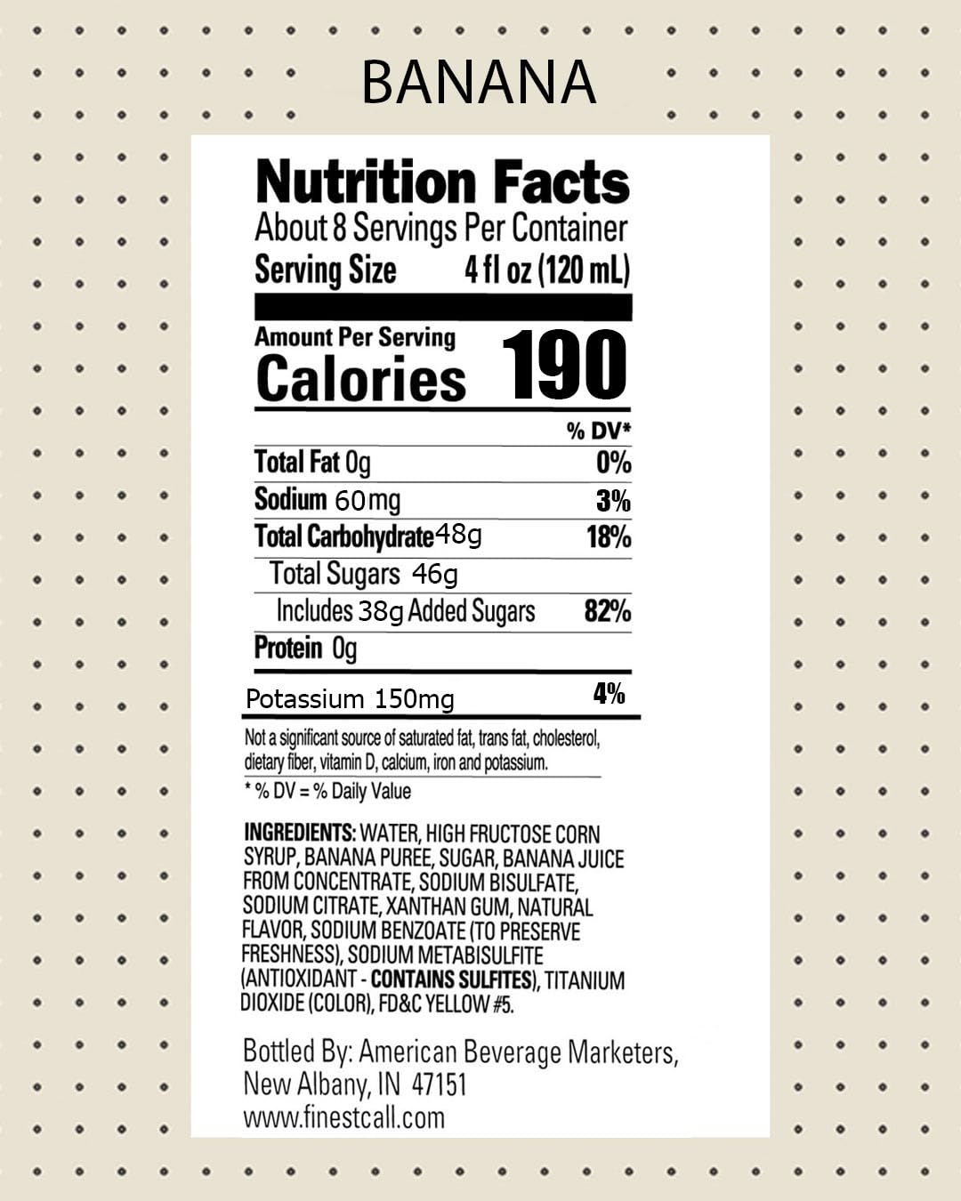 A single, 1 liter (33.8 fl oz) bottle of Finest Call Premium Banana Puree Drink Mix comes individually boxed.