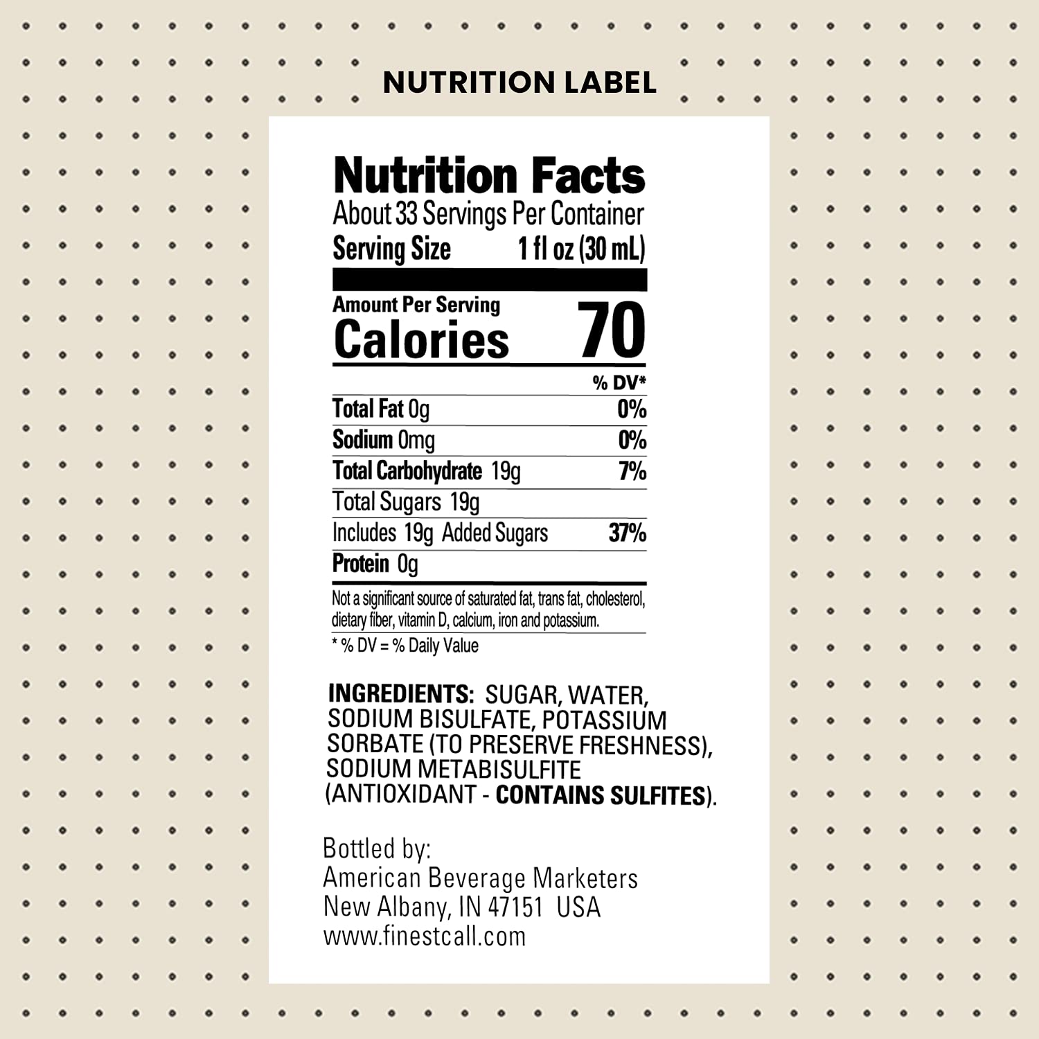 - Q: How is this simple syrup different from regular sugar? A: Unlike regular sugar, which can crystallize and requires cooking, Finest Call Premium Sugar Syrup is made from pure cane sugar and carbon-filtered water, ensuring a smooth consistency that dissolves easily in beverages without the hassle of preparation.