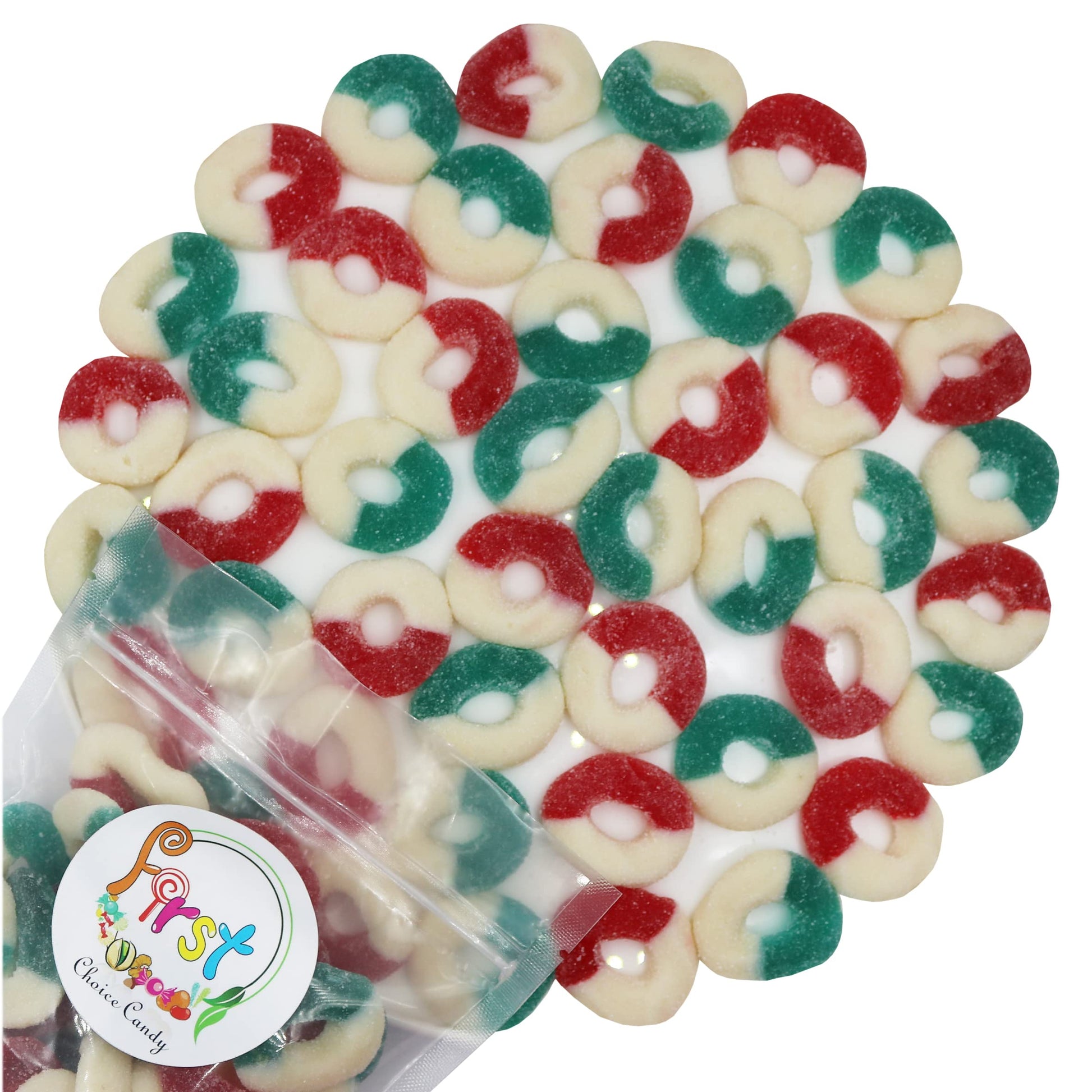 Q: What are FirstChoiceCandy Gummi Rings made of?A: FirstChoiceCandy Gummi Rings are made from high-quality gummy ingredients that provide a chewy texture and sugary flavor. They are perfect for satisfying your sweet tooth.