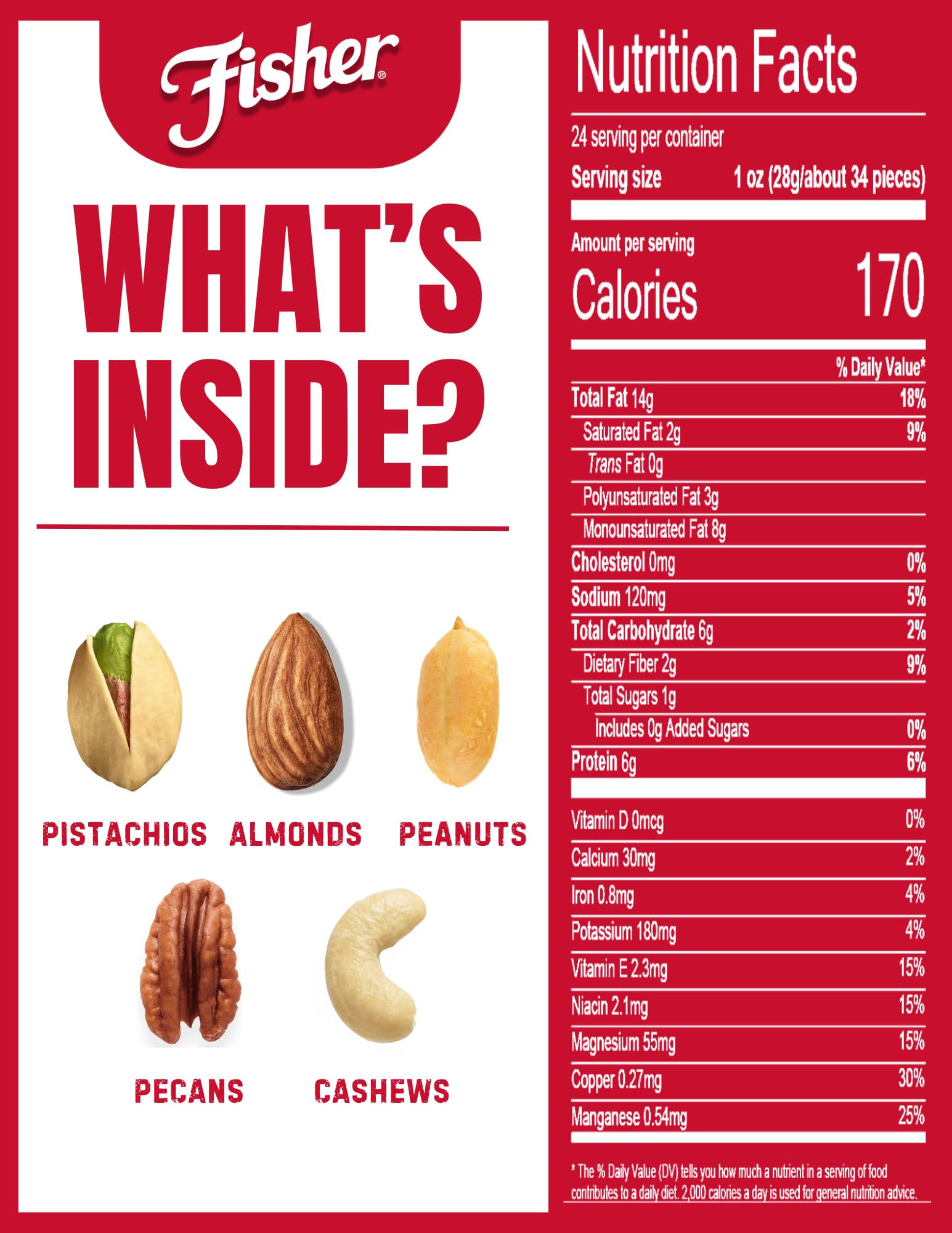 Key Features:- Contains 1-24 Ounce reusable canister of Fisher Snack Oven Roasted Never Fried Mixed Nuts, featuring Peanuts, Almonds, Cashews, Pistachios, and Pecans.