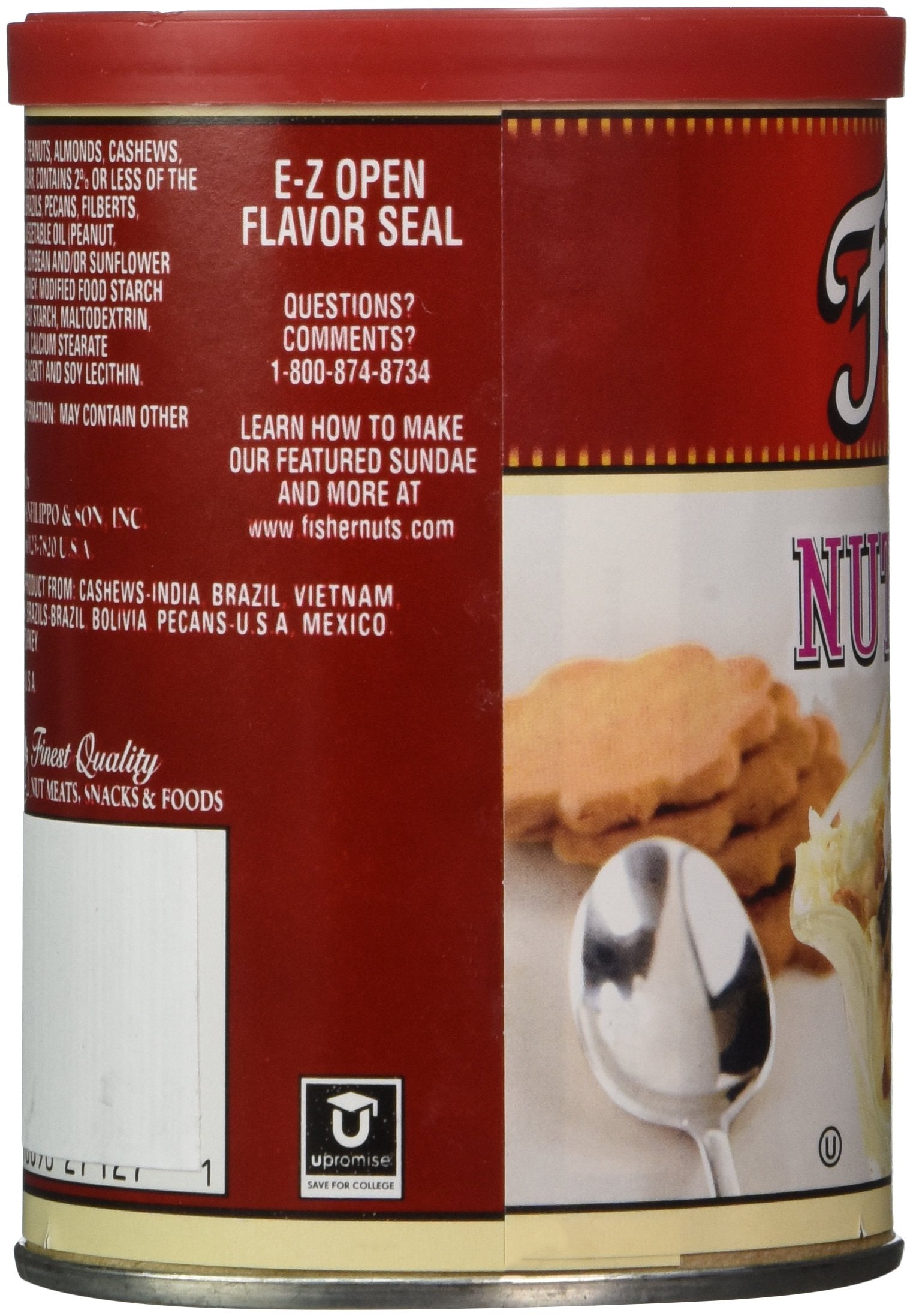 Q: What are the ingredients in Fisher Nut Topping, Mixed Nut Variety?A: Fisher Nut Topping, Mixed Nut Variety typically includes a blend of various nuts such as almonds, cashews, and peanuts. For the most accurate information, please refer to the product packaging or the manufacturer's website.