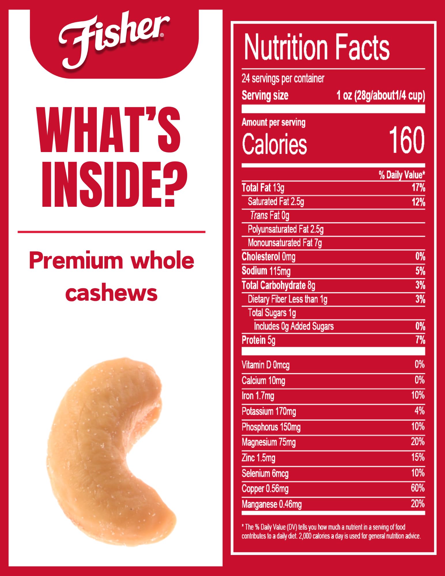 There are few things more delicious than a perfect cashew. They're so satisfying and savory that it's hard to stop snacking. Fisher Premium Whole Cashews are packed with wholesome goodness, rich flavor and that signature crunch you crave. We use only the highest quality nuts – a difference you can taste in bite after bite after bite. Our classic, clear jar highlights the unsurpassed quality of Fisher Nuts which are sourced directly from farmers, many of whom we've worked with for generations. Plus these nuts are a good source of protein, vitamins and minerals including copper, phosphorus and manganese. Fisher is your home for a complete assortment of snack nuts, nut mixes, trail mixes and salad toppings, as well as an extensive variety of baking and cooking nuts.