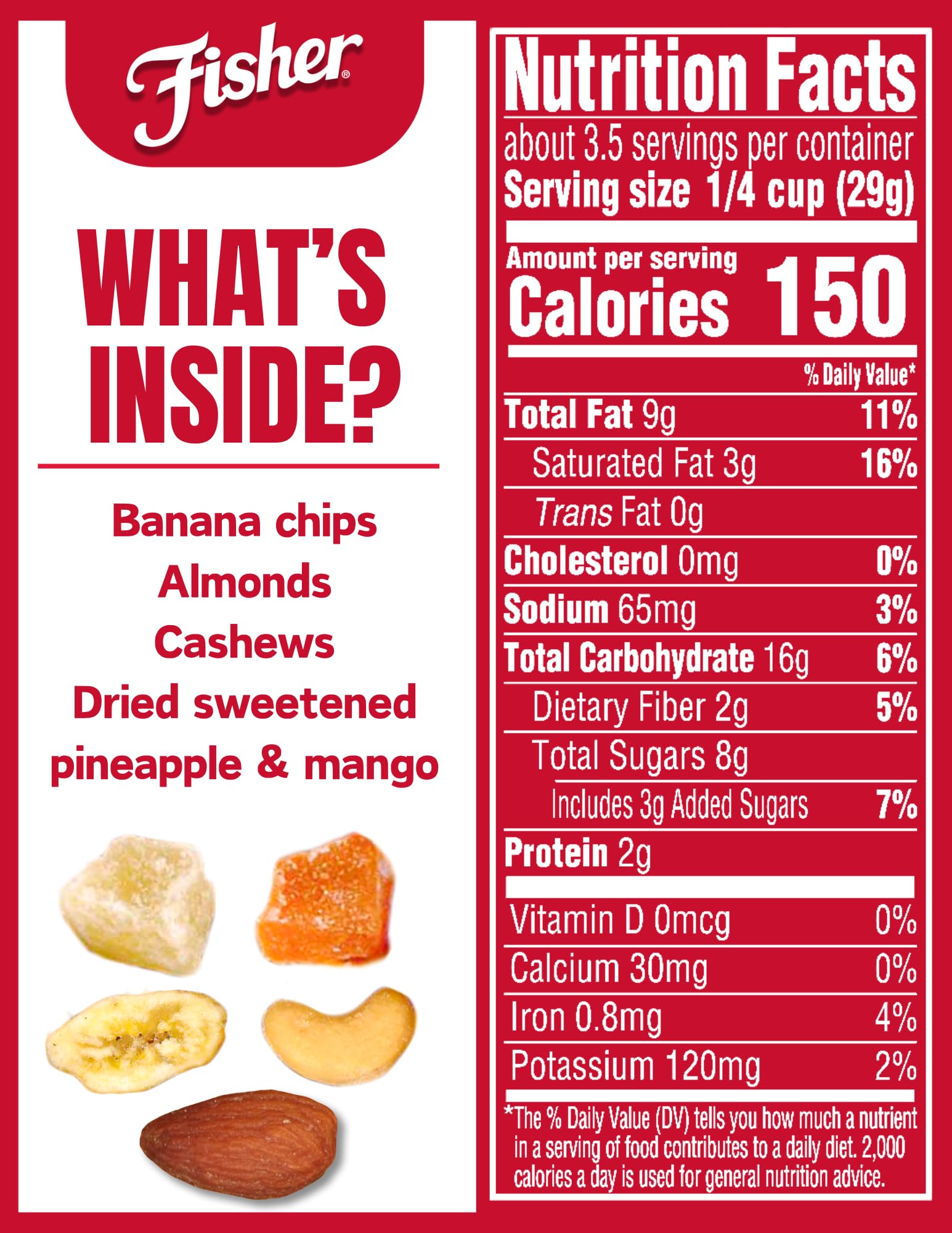 Enjoy A Sweet Taste Of The Islands With This Delicious Mix. Fisher Tropical Trail Mix Features Sweet Mango And Pineapple, Almonds, Cashews, And Banana Chips To Make This Mix A Tropical Delight. Fisher Trail Mixes Are Packed With Rich Flavor And That Signature Crunch You Crave. Our Trail Mix Varieties Provide Delicious, Convenient Options For Wherever The Trail Takes You. Plus, This Trail Mix Is A Good Source Of Protein And Has No Artificial Flavors. Fisher Is Your Home For A Complete Assortment Of Snack Nuts, Nut Mixes, Trail Mixes And Salad Toppings, As Well As An Extensive Variety Of Baking And Cooking Nuts.