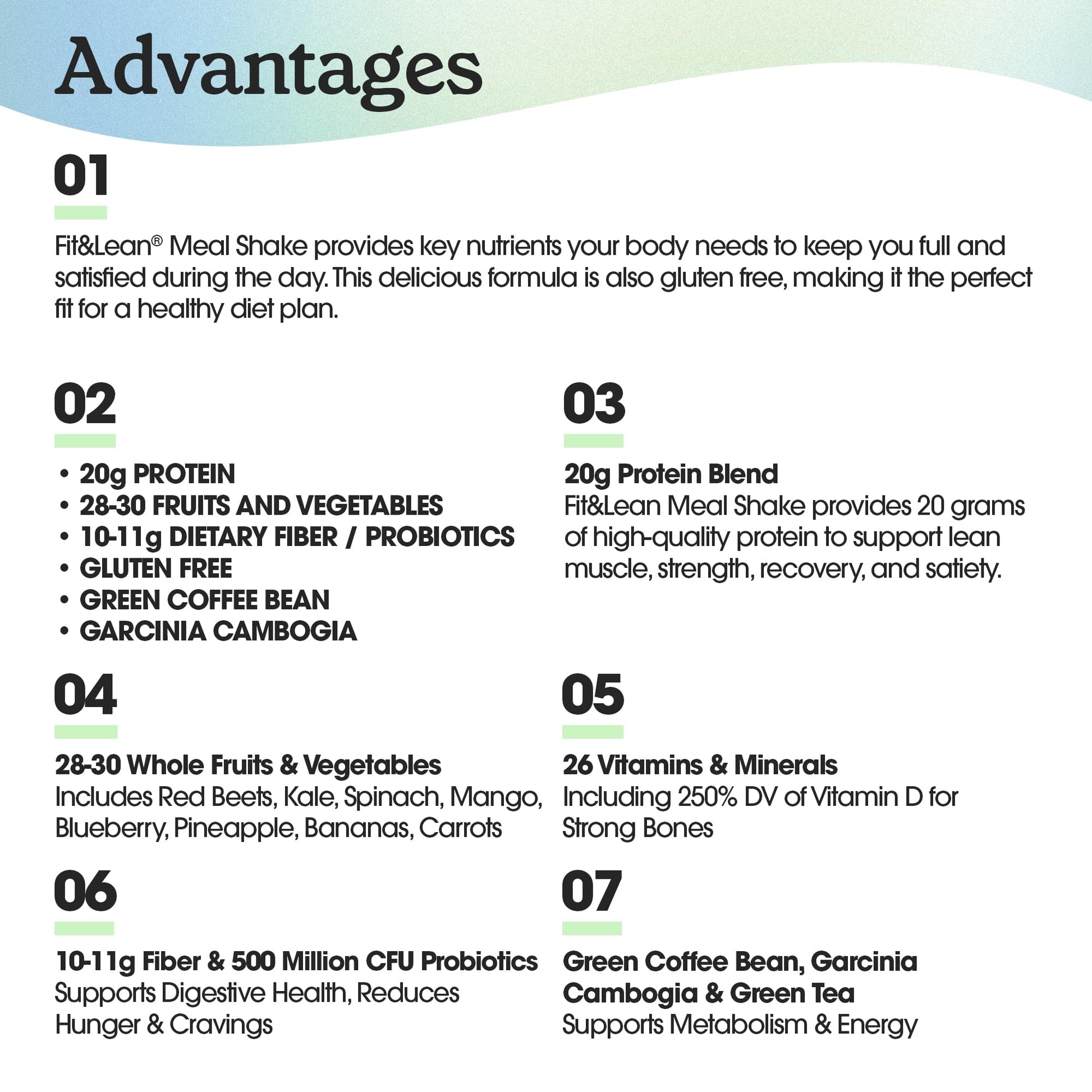 Fit & Lean Meal Replacement Shake is delicious complete nutrition meal replacement powder to help keep you healthy and fit. What does it do? Fit & Lean Meal Shake does multiple things to support better health and fitness. It provides 20g protein to support muscles , metabolism boosting herbs to support weight management, fiber and probiotics to support digestive health and hunger control and powerful anti-oxidants to support your immune system and recovery. What makes Fit & Lean Meal Replacement better than other shakes? Fit & Lean Meal Shakes are much more multi-dimensional than most other meal replacements and protein shakes. Meal Shake is a research backed formula manufactured under the highest quality cGMP standards. It has been used by hundreds of thousands of consumers to help them achieve their health and fitness goals. In addition to the unpatrolled science of this formula, Fit & Lean Meal Shakes also offer unparalleled taste.